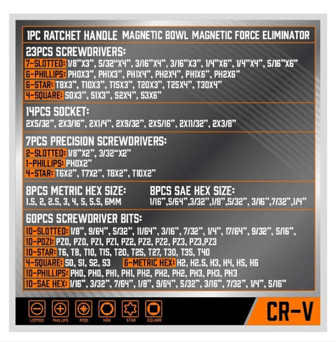 6-PHILLIPS: PH0 X 3”, PH1 X 3”, PH1 X 4”, PH2 X 4”, PH1 X 6”, PH2 X 6”