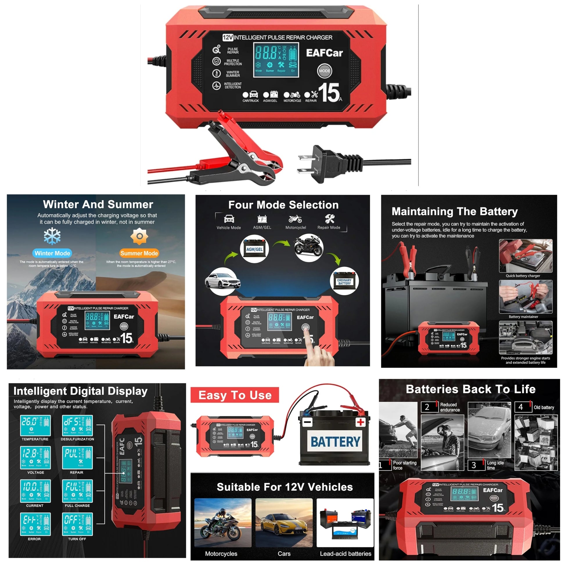 15-Amp Battery Charger, 12V Trickle Charger Car Battery Charger, Smart Automatic Lead Acid Charging with Temperature Compensation for Car Truck Lawn Mower Boat Marine(15A)