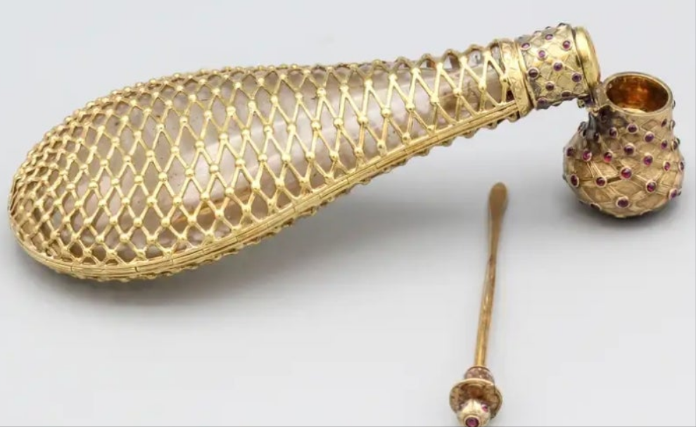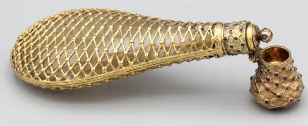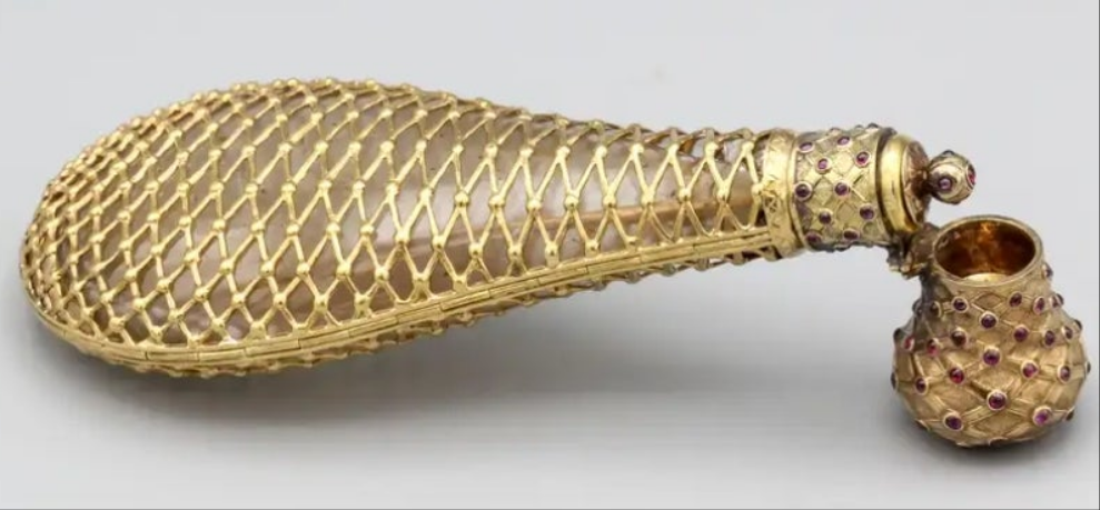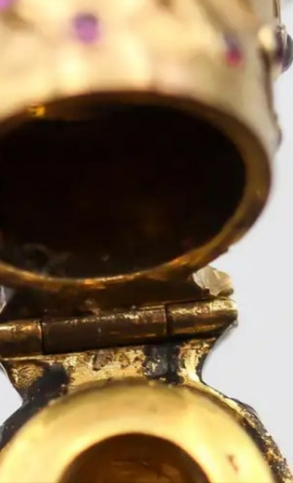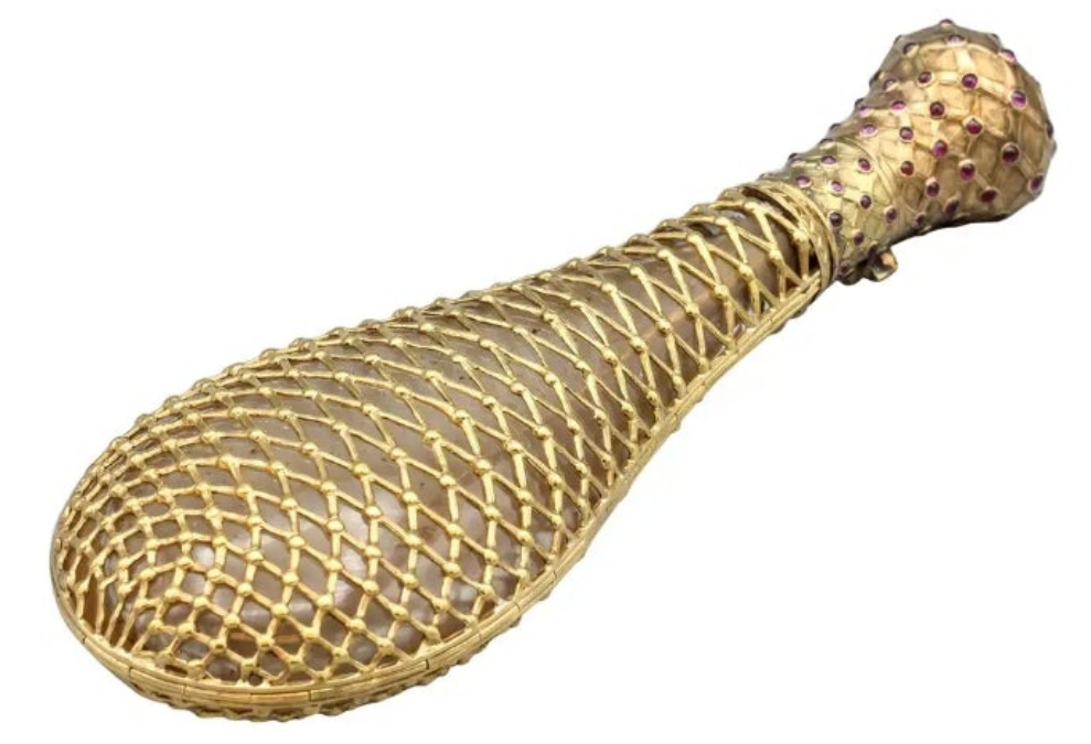 COCOMONEY.STORE,,, AUTHENTIC VERIFIED INSPECED GUARANTEED,,,,Very fine and unusual ruby and 18K yellow gold perfume bottle of French origin, circa late 19th century. Originally from the estate of Queen Nazli of Egypt.