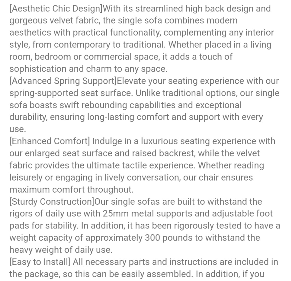 1Pc Modern Velvet Armchair With High Back,Upholstered Accent Chair For Living Room Bedroom