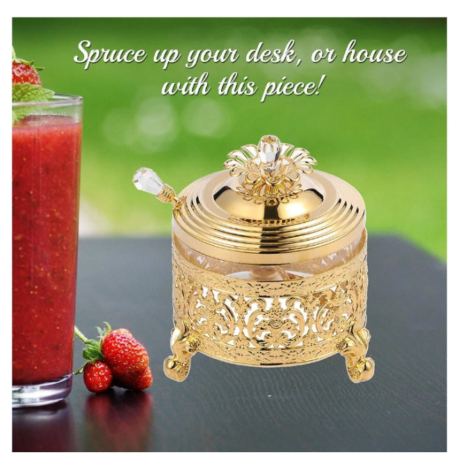24K Gold Plated Sugar Bowl Honey Dish Glass Bowl - Detailed Intricate Design and Flower on Cover with Crystal Studded Spoon Great Gifts idea for Birthday, Mother's Day, Christmas, Anniversary etc