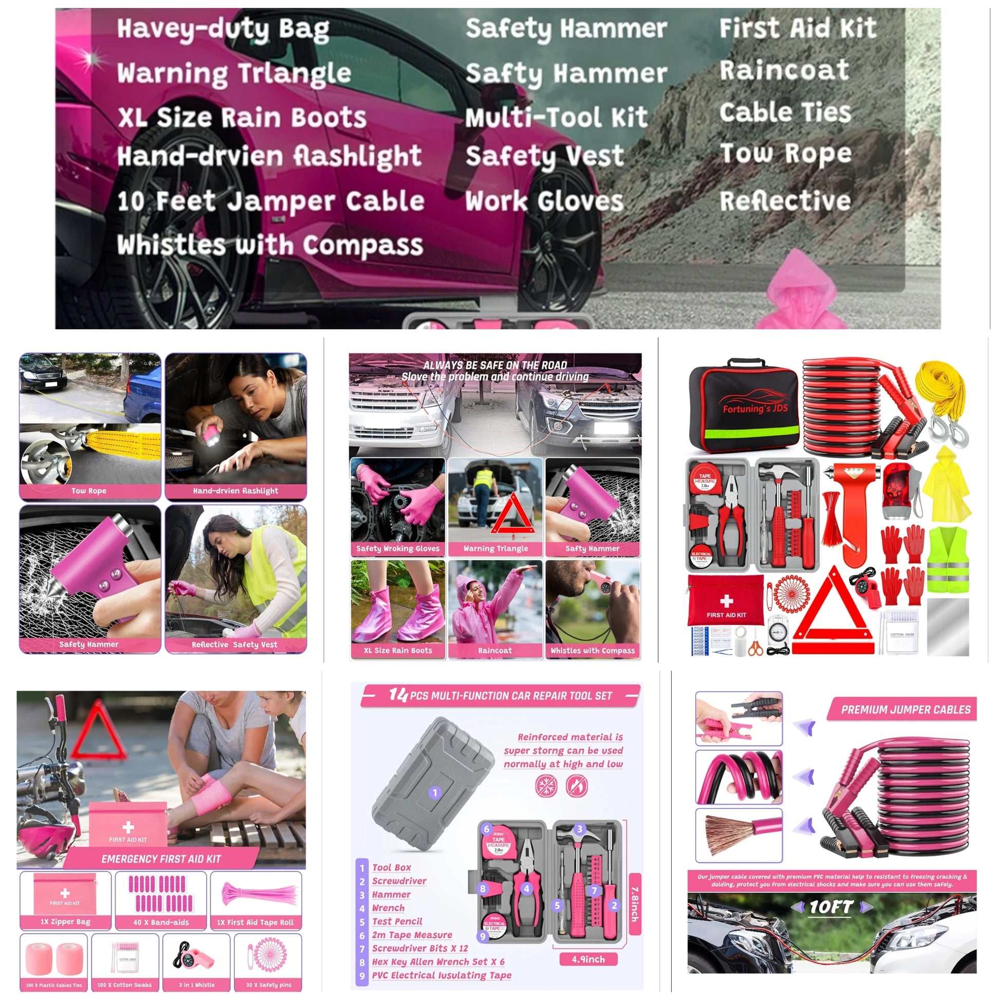 COCOMONEY.STORE..🚗【298PCS SAFETY ESSENTIAL EMERGENCY ROADSIDE KIT】Have you ever stopped a car on the road and desperately waiting for help? To help you deal with most possible accidents, we provide this practical upgraded roadside emergency kit including Jumper Cables, Tow Rope, Safety Hammer, Warning Triangle, Reflective Safety Vest, Rain Coat and shoes, Repair Tool Kit and a fully equipped first aid kit. 298 PCS items can maximize your safety in the event of a breakdown or accident.