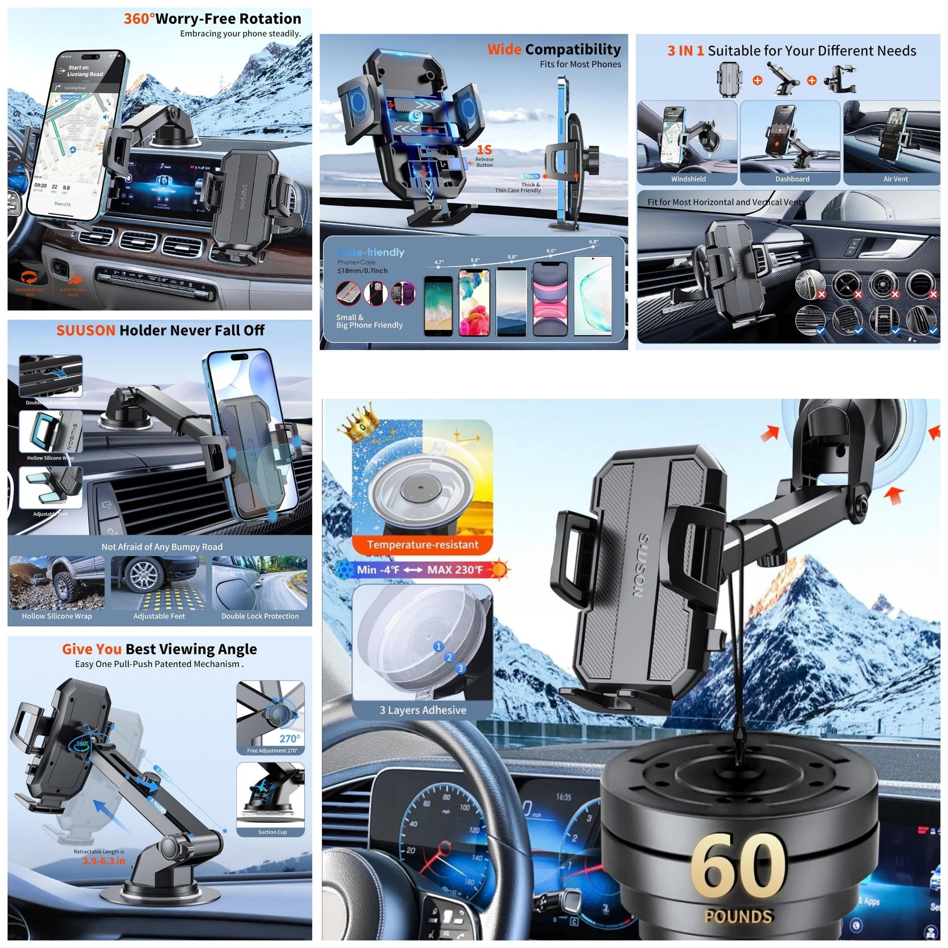 3-In-1 Car Mount: Can install it on the dashboard, windshield or vent. Unrivaled Adhesion: Uses a powerful 3-layer viscous gel suction cup and a 1-step locking mechanism to provide powerful suction. One Button Release: One-handed lightly touch, release or lock the phone within a few seconds. 360-Degree Rotation: 360° ball joint and extendable telescopic arm (4.43"-7.31") allow you to adjust the phone to any angle.3-In-1 Car Mount: Can install it on the dashboard, windshield or vent. Unrivaled Adhesion: Uses a powerful…