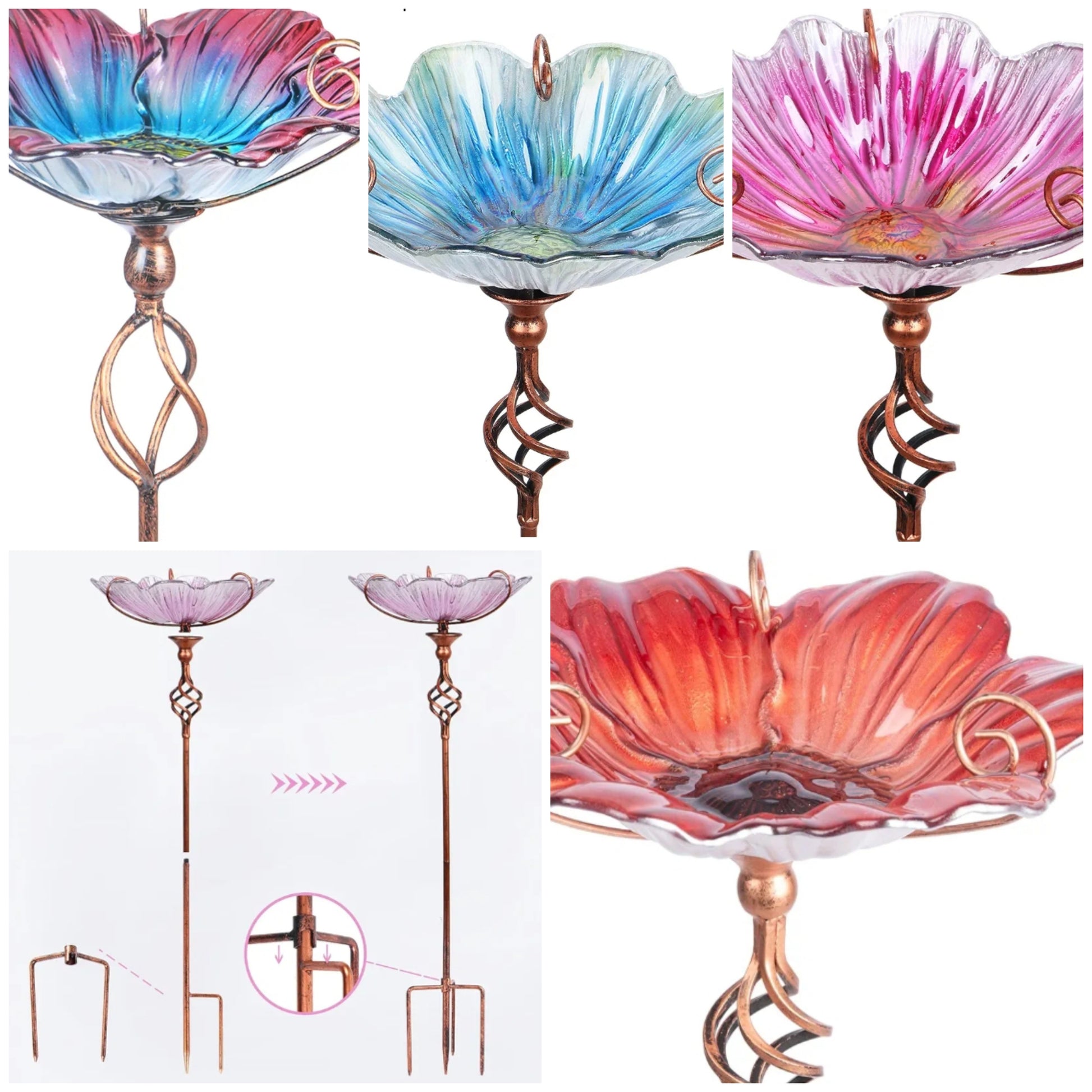 31 Inch Height Glass Birdbath Birdfeeder with Metal Stake Garden Yard Outdoor