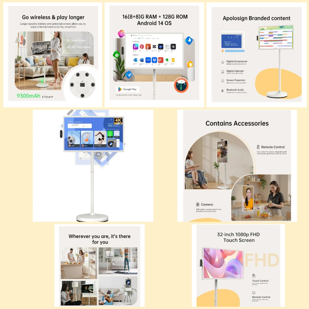 [Custom Calendar Widgets & Digital Screensavers] Unlike other smart portable TVs, ApoloSign's 2nd Gen is newly upgraded with customized desktop calendar widgets and rich digital screensavers. Designed specifically for families, it's easy to coordinate tasks, reminders, and important events. Syncs seamlessly with Google Calendar, Outlook Calendar, Google Tasks, other calendar apps (via Google Calendar subscription), and to-do lists, ensuring your schedule is always up-to-date and accessible.