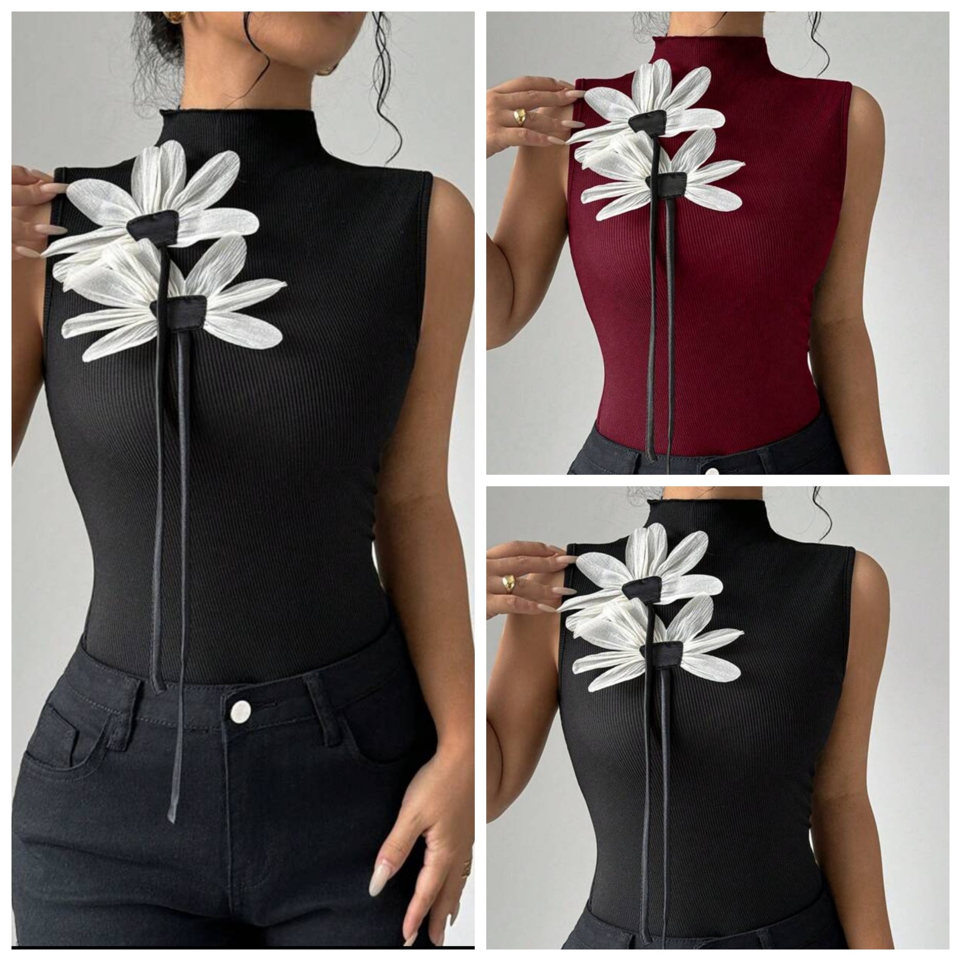 3D Floral Decor Crew Neck Short Sleeve Fitted T-Shirt COCOMONEY