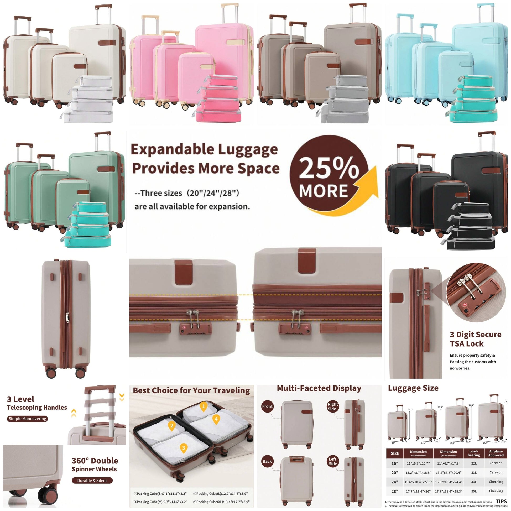 4 Piece Luggage Set With Compression Packing Cubes For Suitcase Expanable Spinner Wheels Lightweight Suitcase With TSA Lock 16 IN+20IN+24IN+28IN Travel Suitcase Suitcases Suit Case Durable Travel Luggage Waterproof Carry On Suitcase Hand Luggage Suitcase