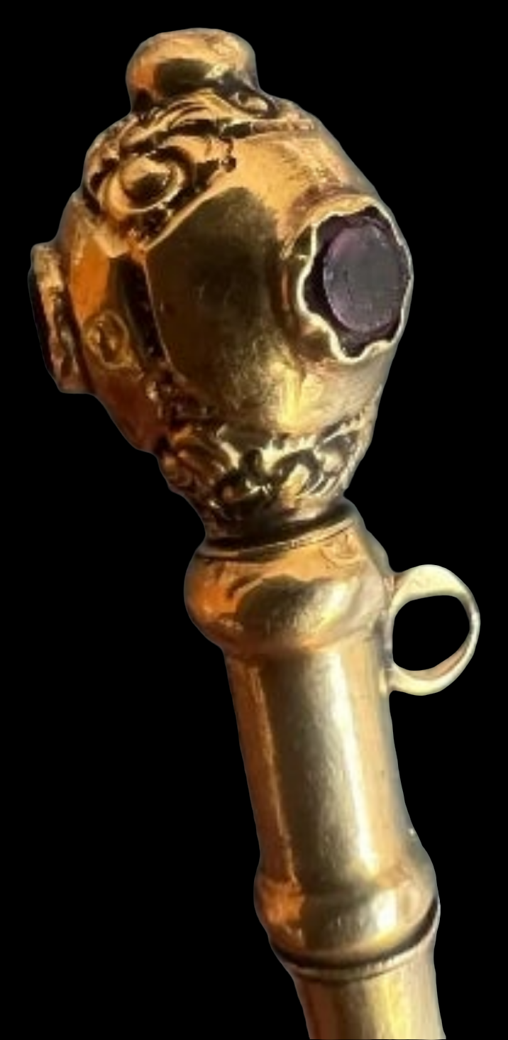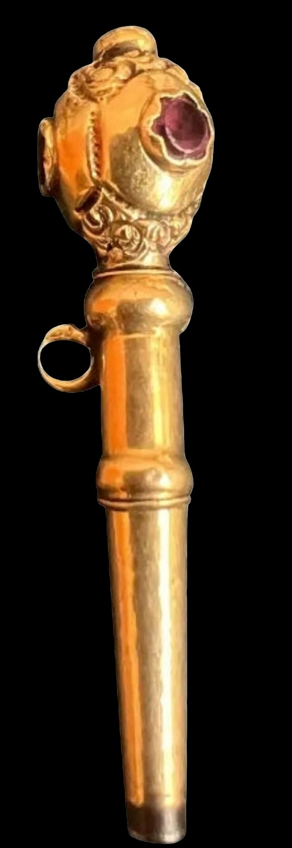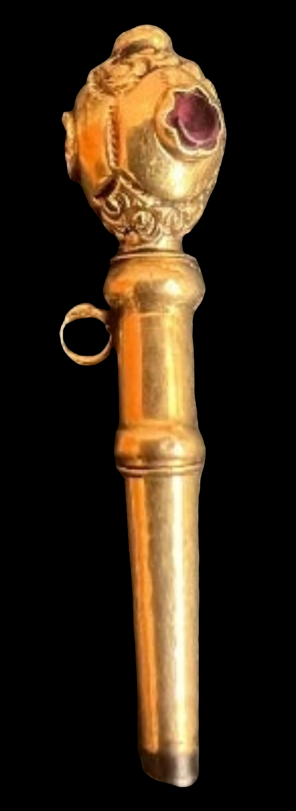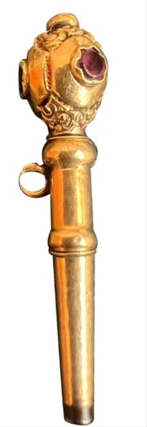 COCOMONEY.STORE,,, AUTHENTIC VERIFIED INSPECED GUARANTEED,,,,French golden engraved pocket watch key that would look great even just as a pendant on a proper chain. It has delicate engravings on the top and three surrounded small ruby stones that gives it a jewellery vibes. It is in original authentic condition with no restorations made. The piece is dated around 1890 and originally come from Paris.
