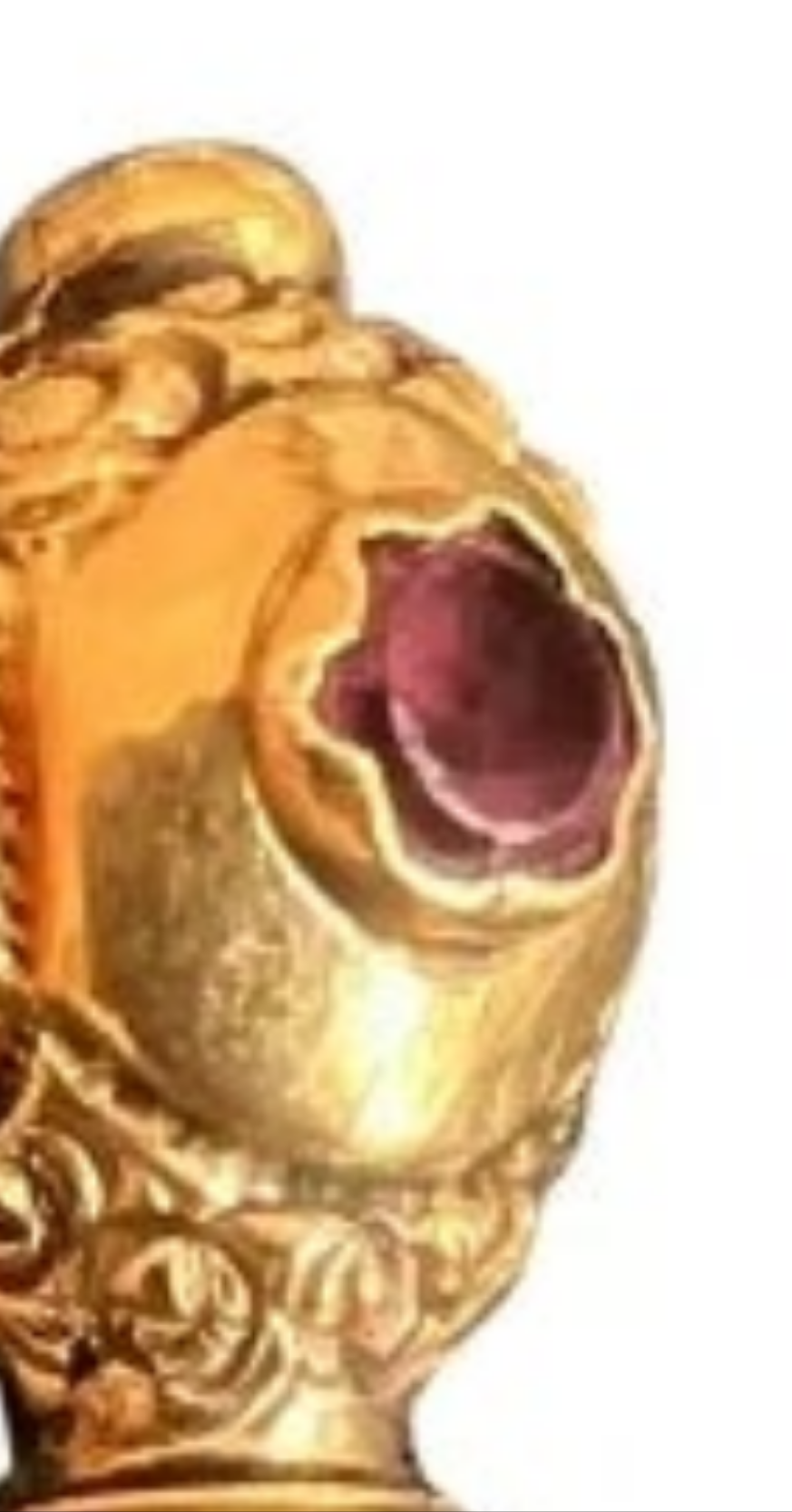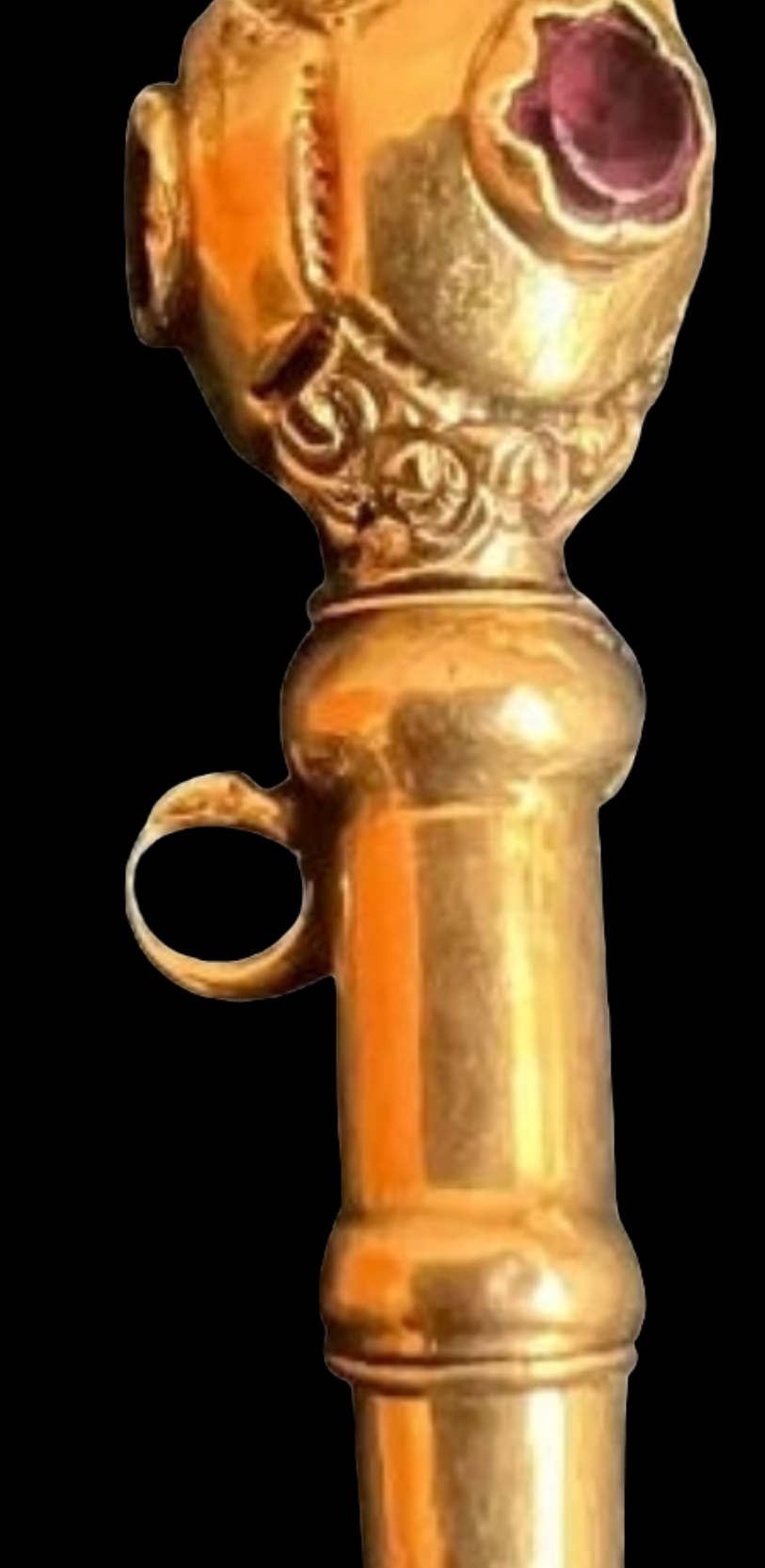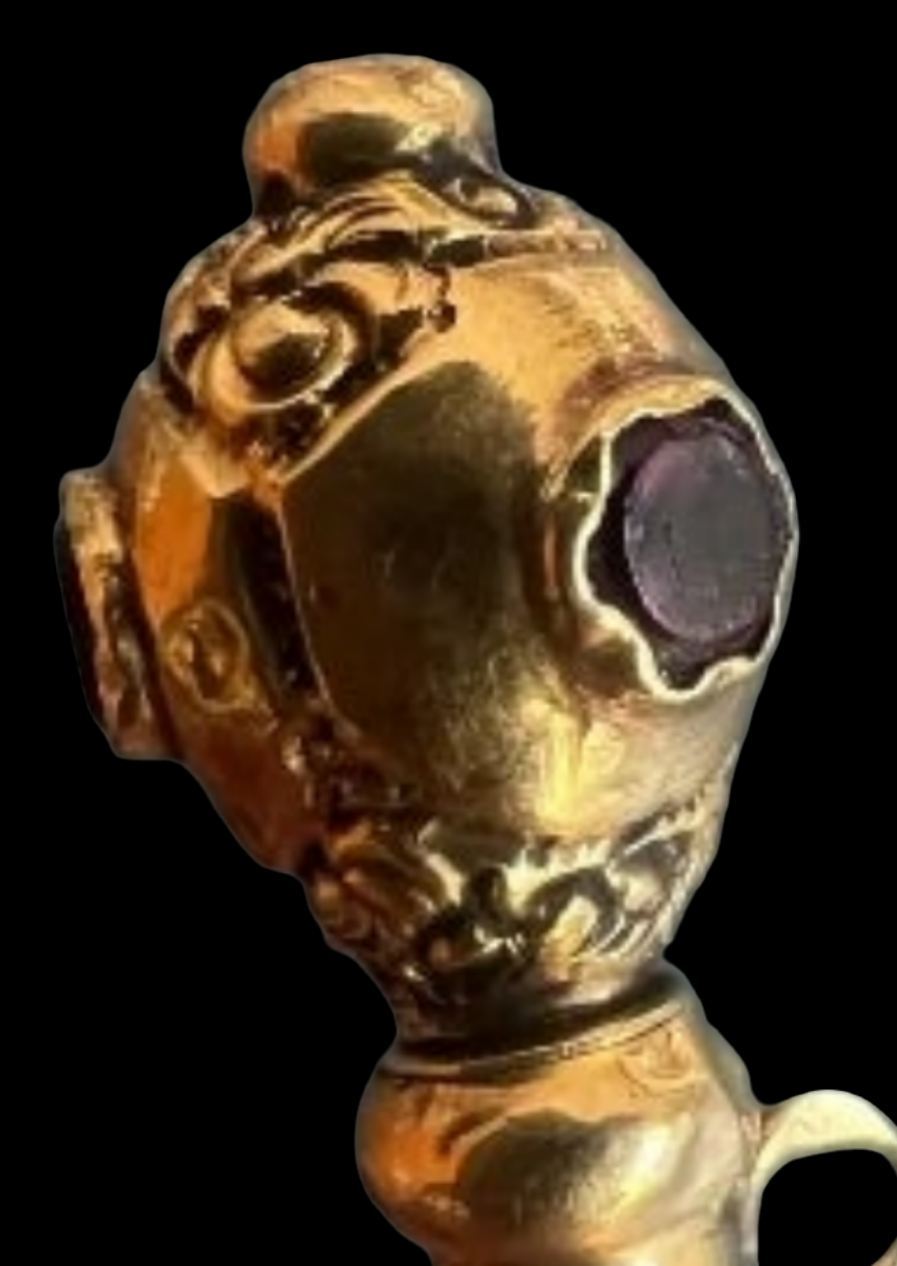 COCOMONEY.STORE,,, AUTHENTIC VERIFIED INSPECED GUARANTEED,,,,French golden engraved pocket watch key that would look great even just as a pendant on a proper chain. It has delicate engravings on the top and three surrounded small ruby stones that gives it a jewellery vibes. It is in original authentic condition with no restorations made. The piece is dated around 1890 and originally come from Paris.