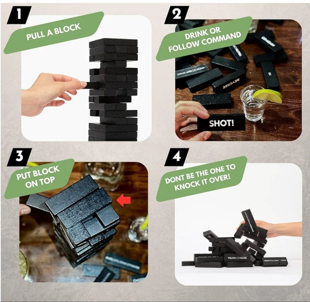 WHATS INCLUDED - 54 blocks with hilarious games and commands on 40 of them. Comes in carrying box with a list of rules and all the blocks explained. Bring the party anywhere you go! Take a block & follow the rules. Play just like the classic stacking game with a tipsy twist.