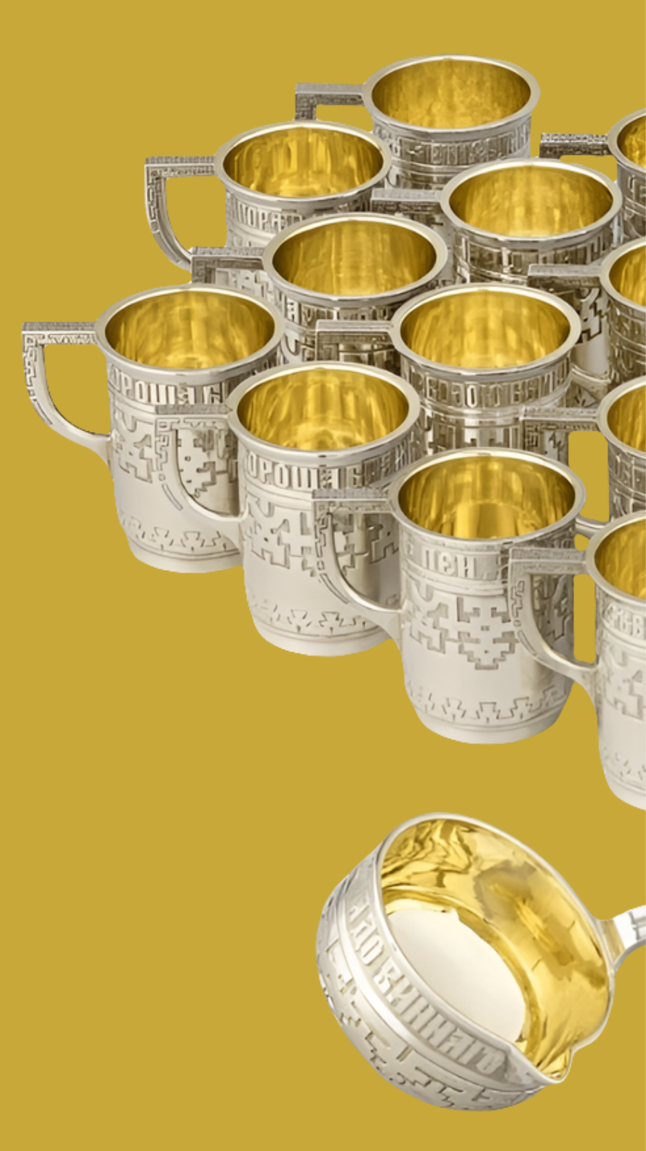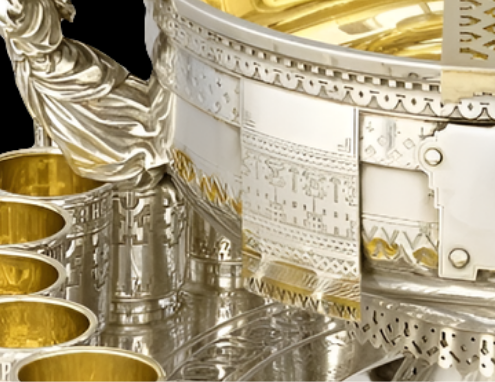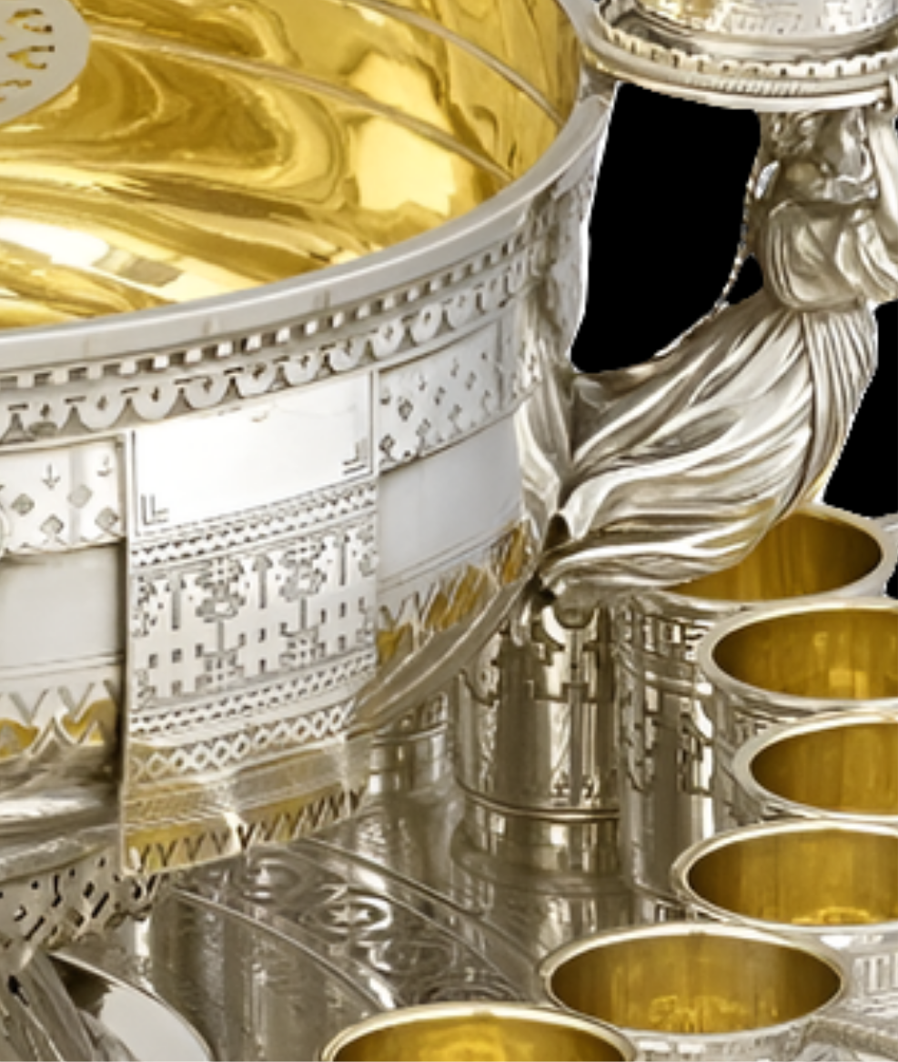 The service was commissioned by the Czar from the House of Sazikov, the oldest silversmith and jewelry firm in Russia. Sazikov was established in 1793 by the merchant Pavel Sazikov, and became supplier to the Imperial Court in 1837. The firm, which maintained factories in Moscow and St. Petersburg, became renowned for its high quality silverware, silver sculptures, cloisonné enamels and statuettes with national motifs. The firm exhibited several cups and centerpieces at the Great Exhibition of 1851 in London, and from 1846, held the Imperial Warrant.