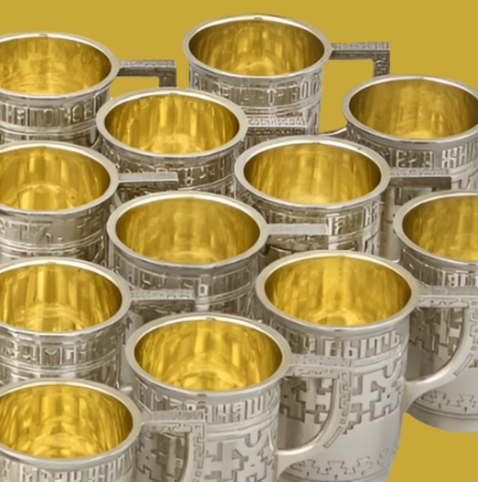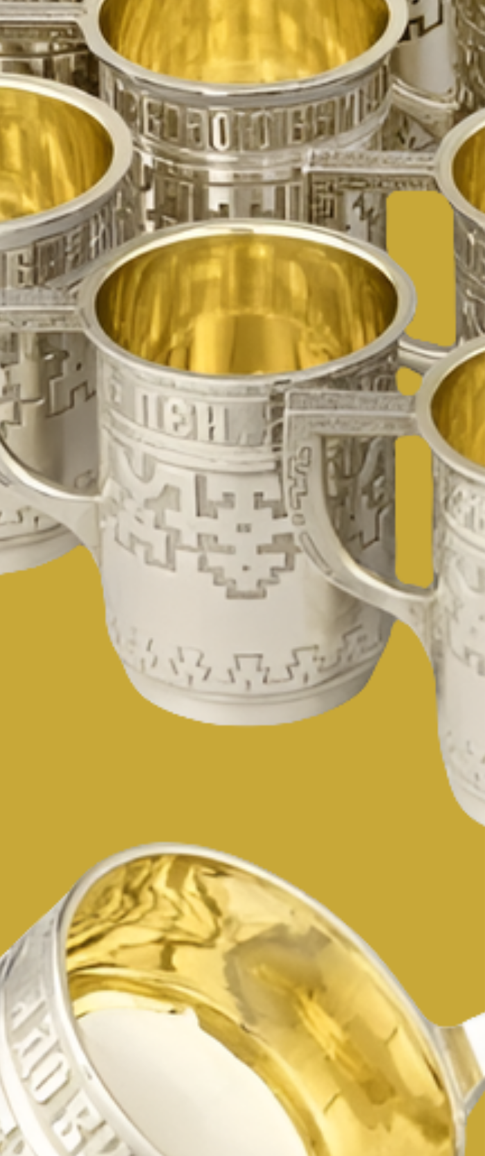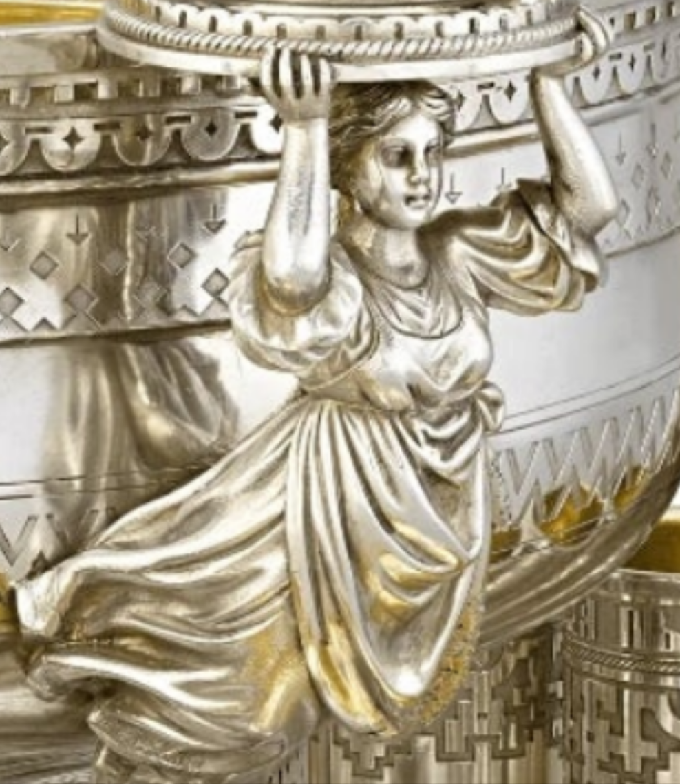 The service was commissioned by the Czar from the House of Sazikov, the oldest silversmith and jewelry firm in Russia. Sazikov was established in 1793 by the merchant Pavel Sazikov, and became supplier to the Imperial Court in 1837. The firm, which maintained factories in Moscow and St. Petersburg, became renowned for its high quality silverware, silver sculptures, cloisonné enamels and statuettes with national motifs. The firm exhibited several cups and centerpieces at the Great Exhibition of 1851 in London, and from 1846, held the Imperial Warrant.