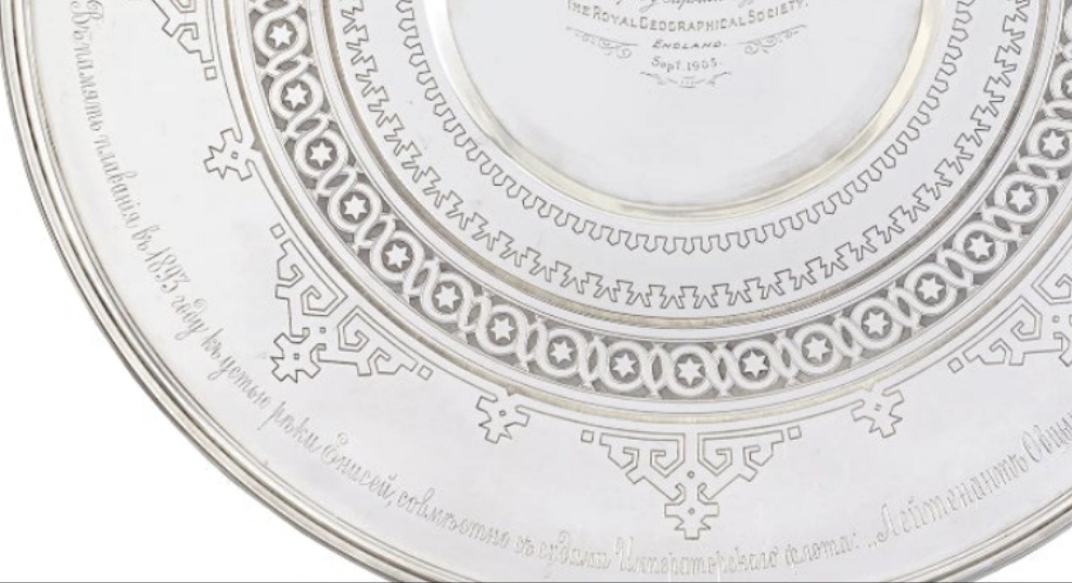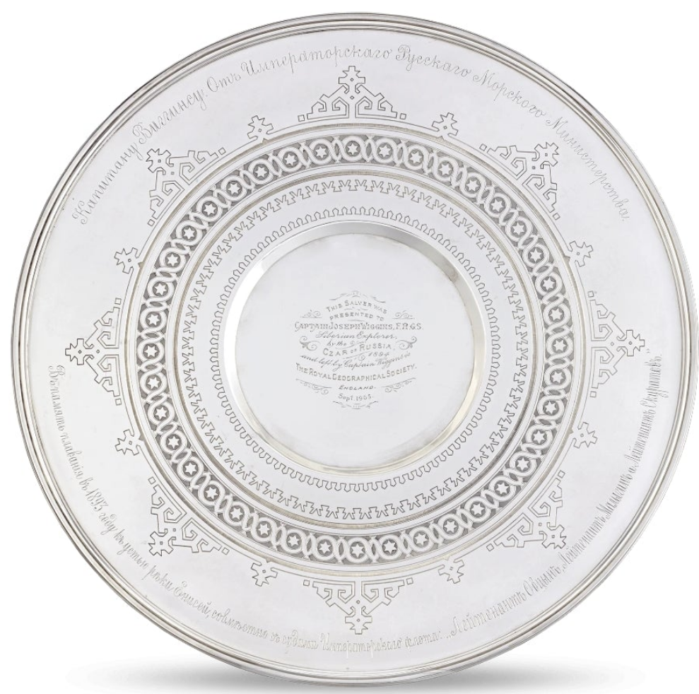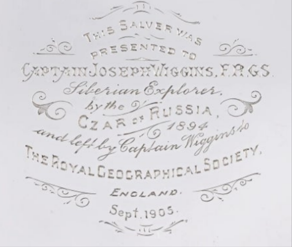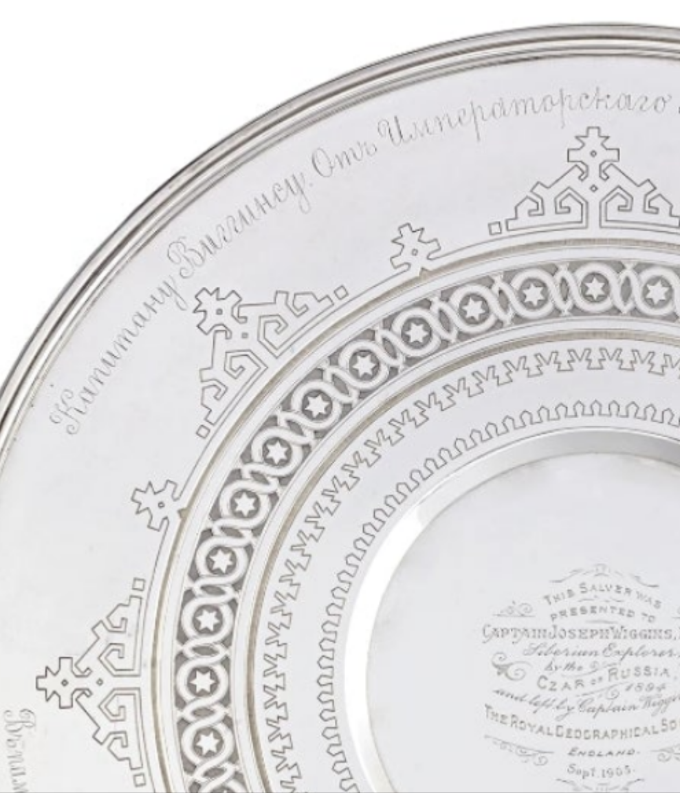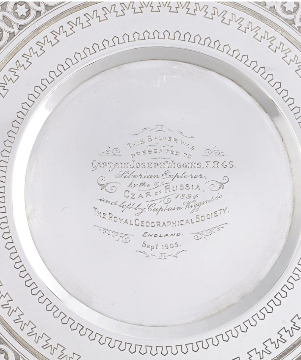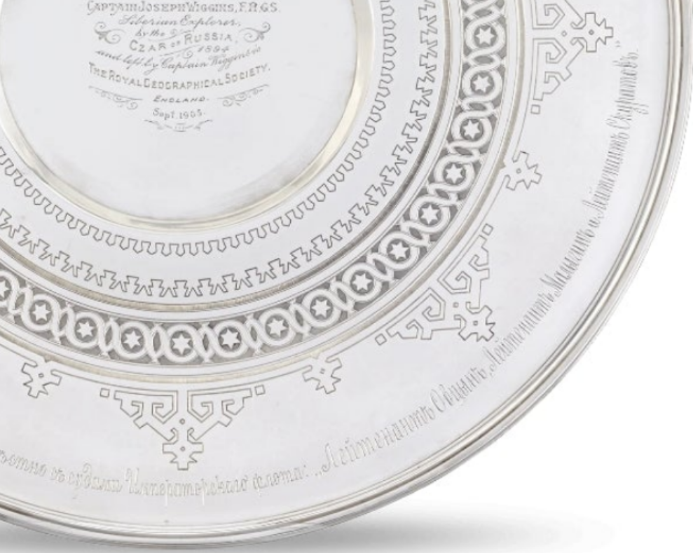 The unique charm of this punch service lies not only in its craftsmanship and historical relevance, but also in the inclusion of old drinking proverbs in Slavic. From "The heart burns at the thought of wine" to "Good fellowship is better than wealth," these sayings — inscribed on the cups and ladles of the set — add a touch of cultural richness and reflect the convivial spirit of the meeting. Further inscriptions offer credit to Wiggins for his endeavors. The edge of the tray is inscribed by the Russian Naval Ministry and reads: “To Captain Wiggins from the Imperial Russian Naval Ministry. In memory of the voyage in 1893 to the mouth of the river Enisei, jointly with the ships of the Imperial fleet, Lieutenants Ovtsyn, Malygin and Skuratov.” The center of the tray features another laudatory inscription from the Royal Geographic Society: “This salver was presented to Captain Joseph Wiggins, F.R.G.S., Siberian explorer, by the Czar of Russia, 1894, and left by Captain Wiggins to the Royal Geographical Society, England, Sept. 1905.”