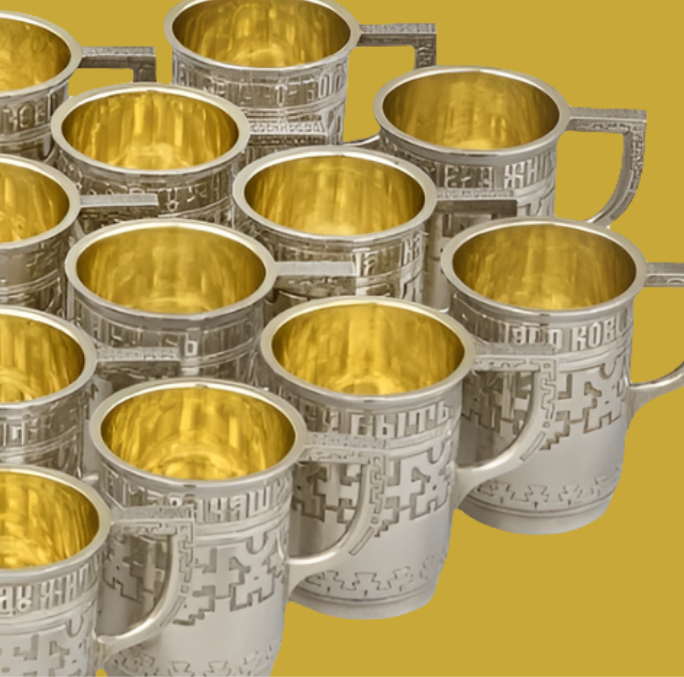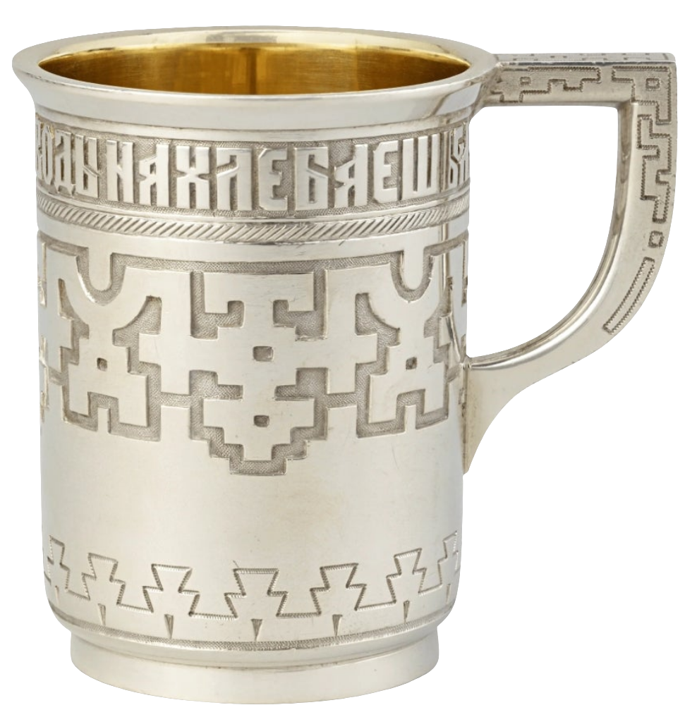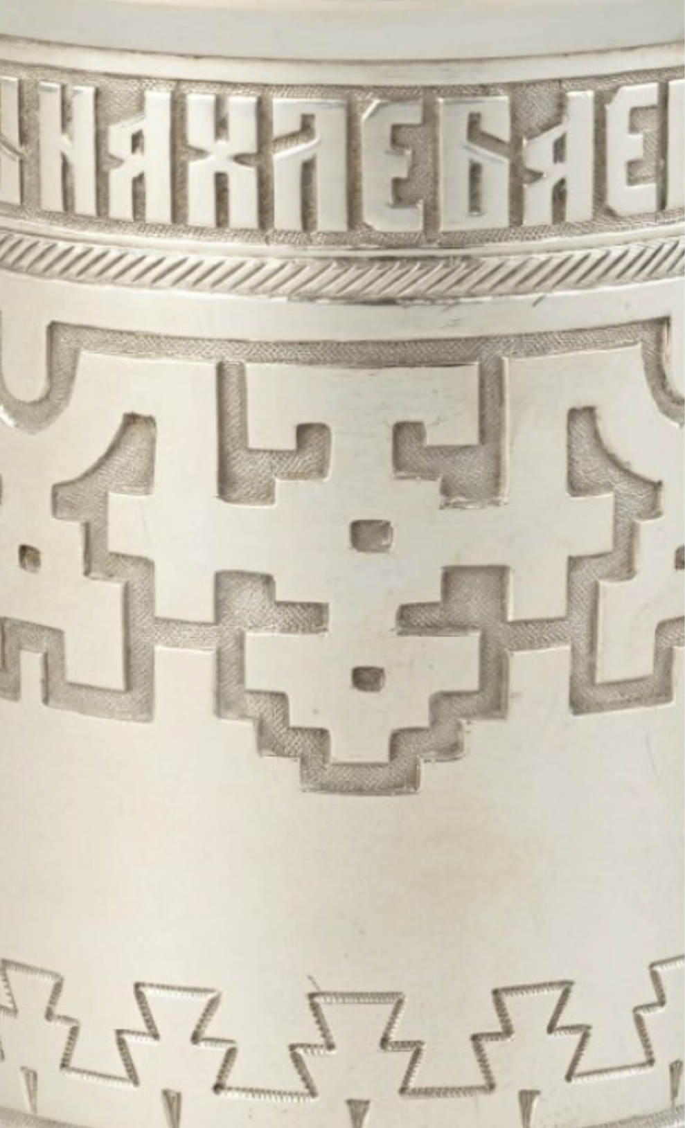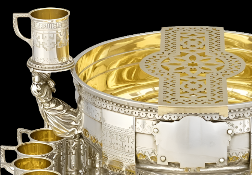 It features drinking proverbs in SlavicA monumental piece of history, this exquisite silver punch set was made for Czar Alexander III as a gift to British Captain Joseph Wiggins. Heavily decorated with rich engravings and proverbs in old Slavic lettering, this service is a grand symbol of celebration and a testament to the beauty of Russian Imperial silver.