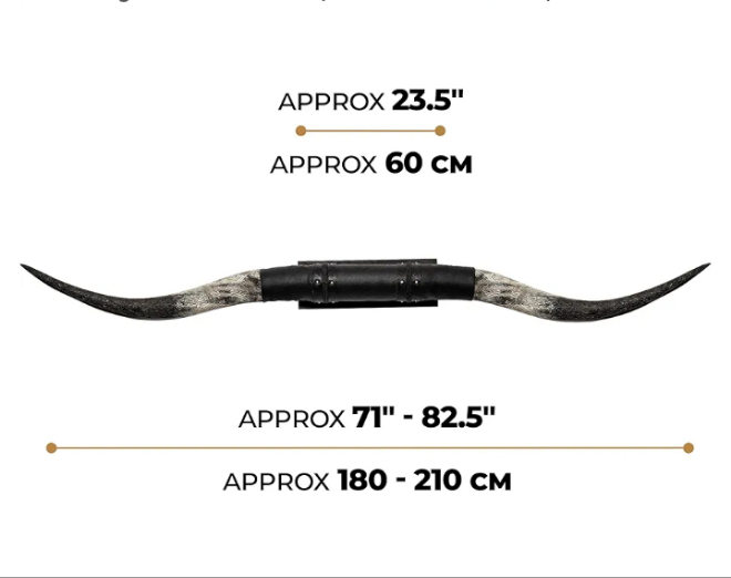 [Measurements] Black Leather Mount // Standard Horns - Big Gun: Length Leather Mount (without horns): 23.5″ / 60 cm, Length (including horns): 71″ - 82.5″ / 180 -210 cm. Size may vary due to the natural curvature of the horns.