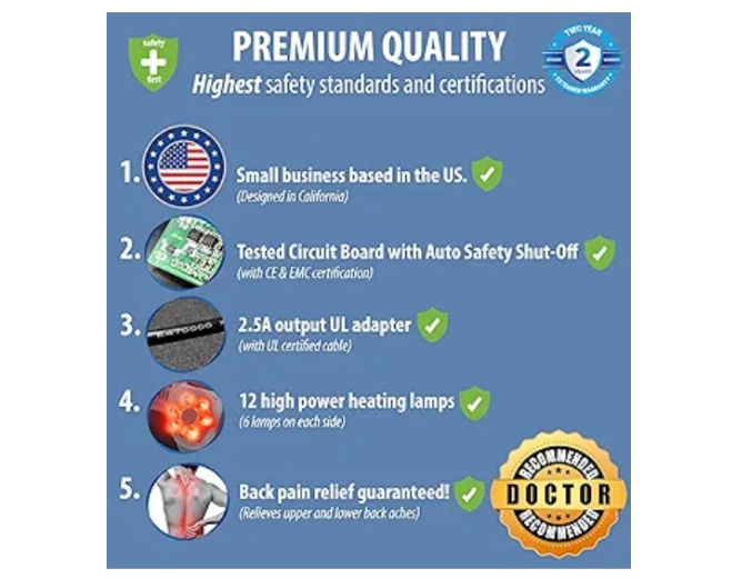 Top Safety Standards, the Zyllion ZMA-13 is thoroughly tested and certified for safety. It features a soothing heat function with overheat protection and automatically shuts off after 20 minutes, ensuring a relaxing shiatsu massage experience.
