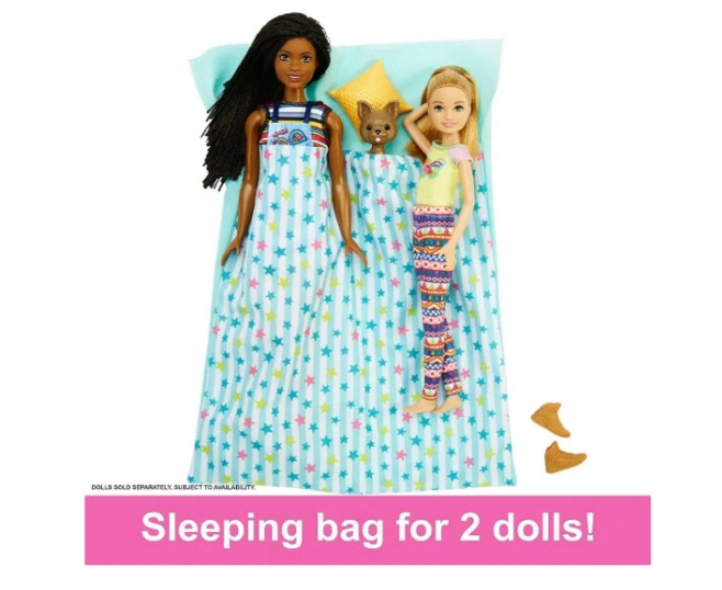 Includes Dream Camper, 1 pool, 1 car seat, 1 firepit, 1 kitchen piece, 4 stools, 1 table, 1 camera, 1 brush, 1 pair of binoculars, 1 flashlight, 1 dog bed, 1 popcorn carton, 1 coffee pot, 1 muffin tray, 2 mugs, 1 milk carton, 1 cushion, 1 juice carton, 1 canteen, 1 pan, 1 egg carton, 1 shampoo bottle, 1 bag of dog food, 2 dog figures, 2 toothbrushes, 1 tootpaste tube, 4 cups, 1 dog bowl, 1 hat, 1 waist bag, 2 marshmallow sticks, 12 flatware pieces, 2 dog bones, 4 plates, 2 blankets, 1 towel, 1 shower curtain and sticker sheet.Hit the road to adventure with the Barbie Dream Camper featuring an epic slide, 7 play areas and everything imaginations need to play out the ultimate camping trip.
