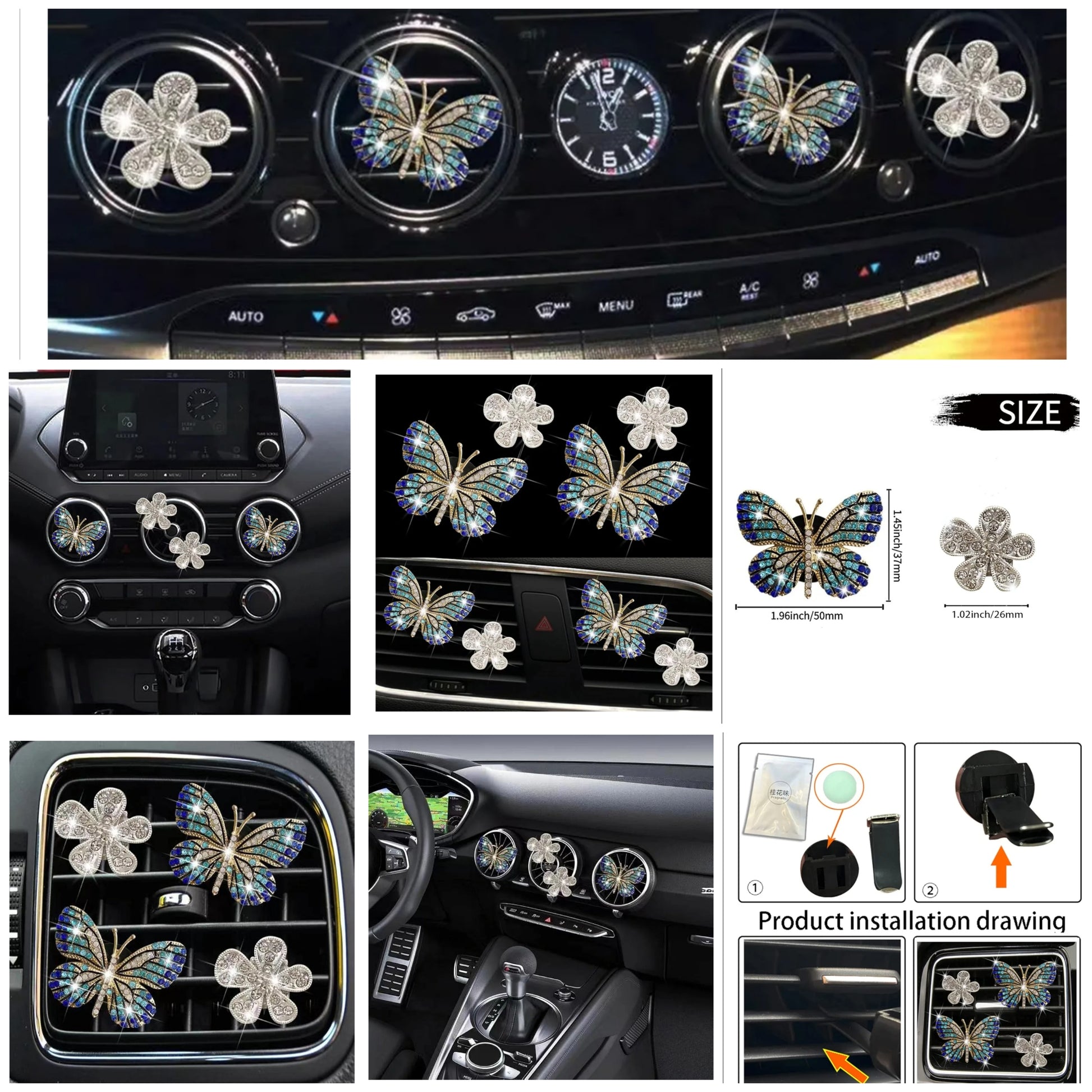 Bling Butterfly Air Vent Clips, 4 Pcs Crystal Daisy Car Air Fresheners Vent Clips Car Diffuser Vent Clip Rhinestone Diamond Flower Car Decoration Car Interior Decor Bling Car Accessories for Women (Blue)