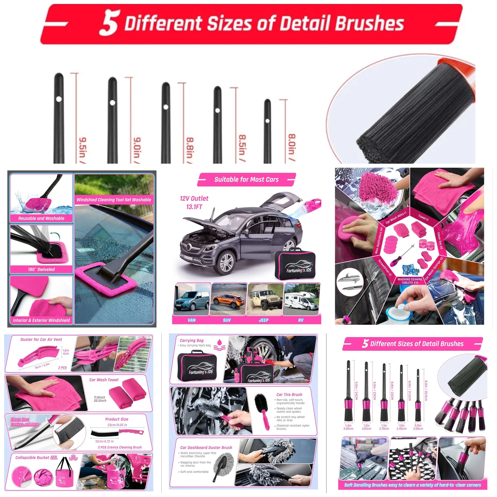 PREMIUM MATERIAL INTERIRO CLEANER - The pink car wash kit is made of soft and durable material & extremely soft, scratch free & lint free. scratch-free and swirl-free. Absolutely safe to clean on delicate surfaces. Car cleaning kits feature ergonomic designs that prevent hand or arm fatigue even during extended periods of use. All car cleaning kit tools are listed in a oxford bag, which is very space-saving and can be placed anywhere in the trunk, rear seat or spare tire box.BEST CUSTOMER SERVICE: If you have any questions, please contact us by email and we will deal with it immediately. We'd like to offer all-around service for you.