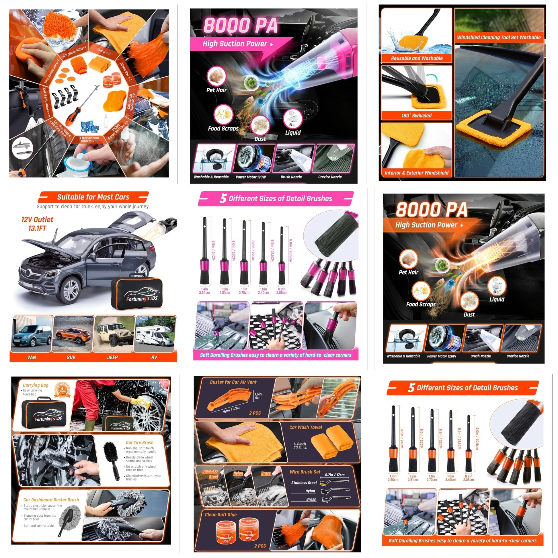 8000 PA POWERFUL CAR VACUUM- This car cleaning interior detailing kit come with powerful car vacuum, which Equipped with a 120W/12V powerful motor, the portable car vacuum cleaner provides strong suction power of up to 8000pa. It can easily clean to terminate any dirt, pet hair or debris. The power cord is 15 feet long makes it easy to clean every nook and cranny in your car's back seat and trunk. And car vacuum attachments - auxiliary connector, brush nozzle and spare HEPA filter.