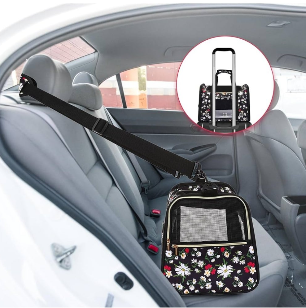 Material & Pockets: Cat travel carrier is made of sturdy nylon with adorable floral pattern, unique and stylish. Pockets on front and back of bag: the front pocket with zip closure for cat treats storage; the back also with zip closure for phone, cards. Comes with shoulder strap and a built-in safety belt.