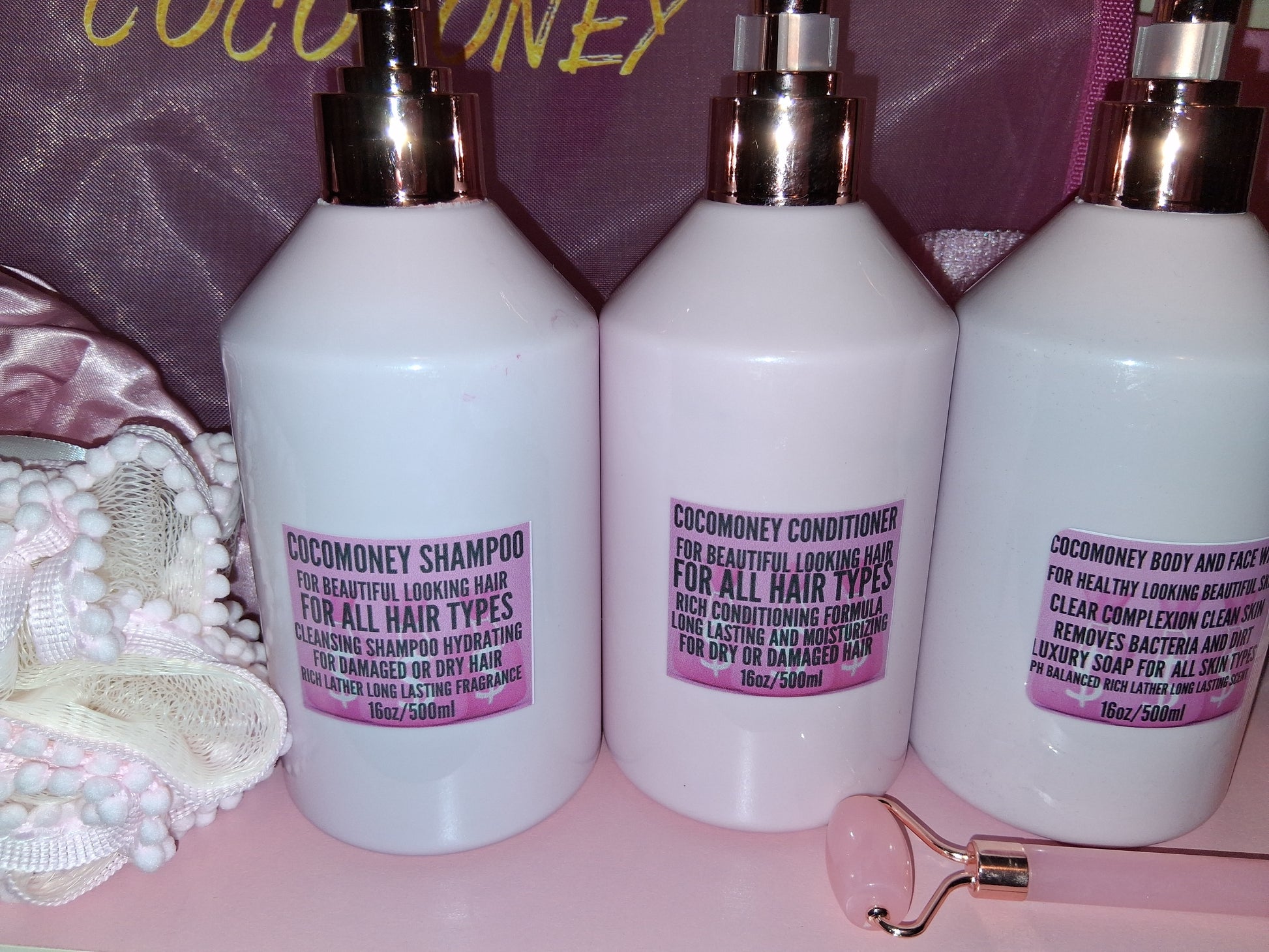 COCOMONEY LUXURY PINK BATH SET SHAMPOO CONDITIONER FACE AND BODY WASH PINK WITH FREE BAG 16oz AND GIFTS packaging may vary