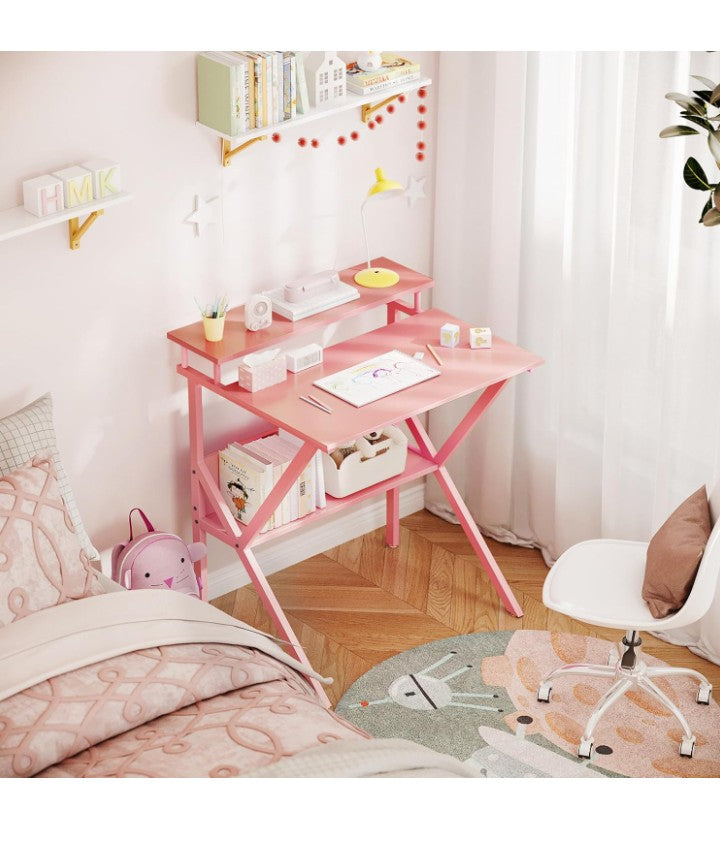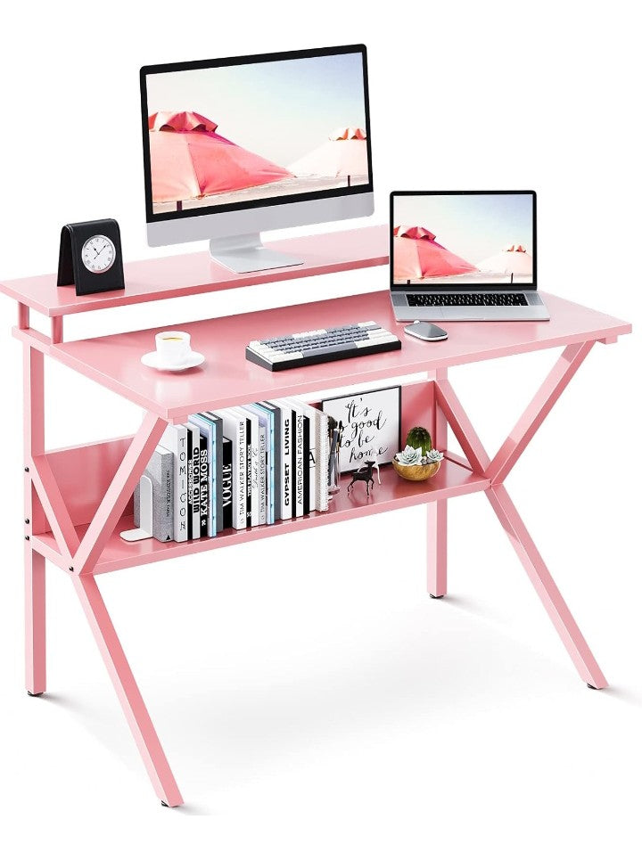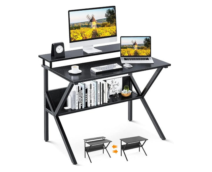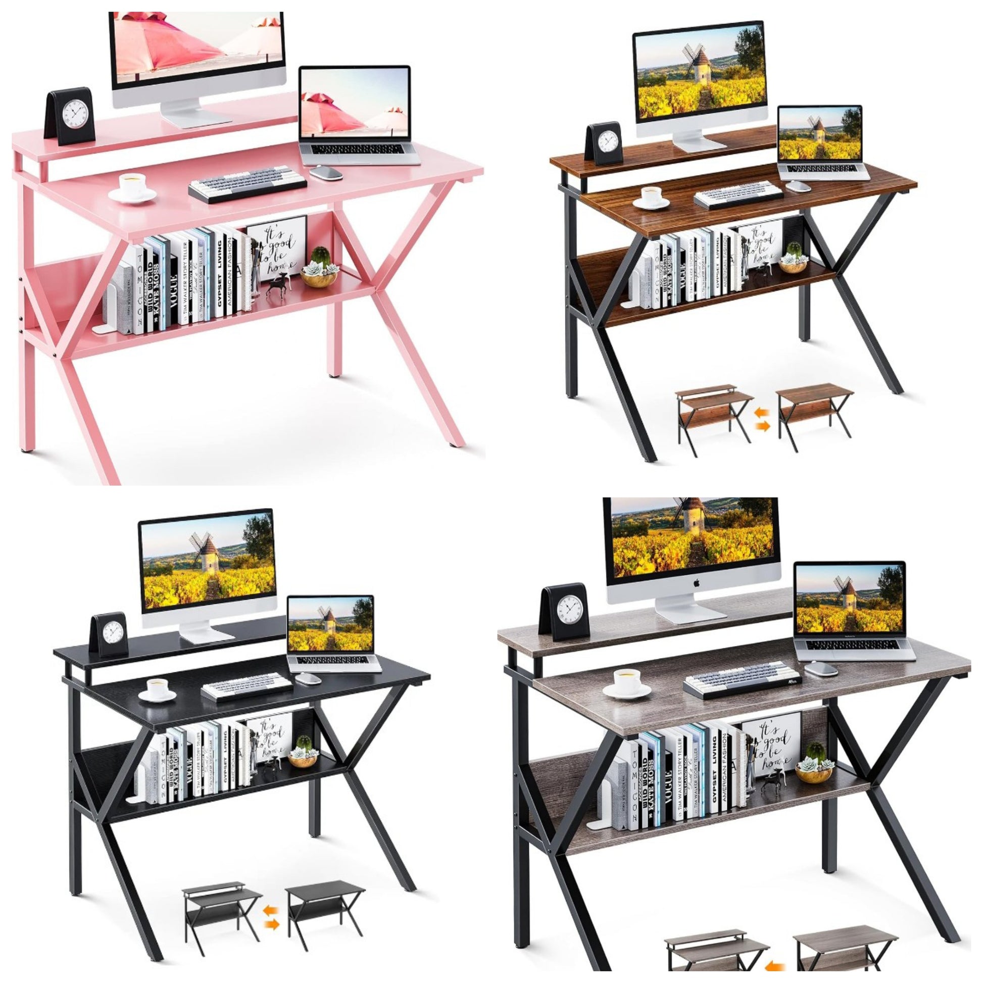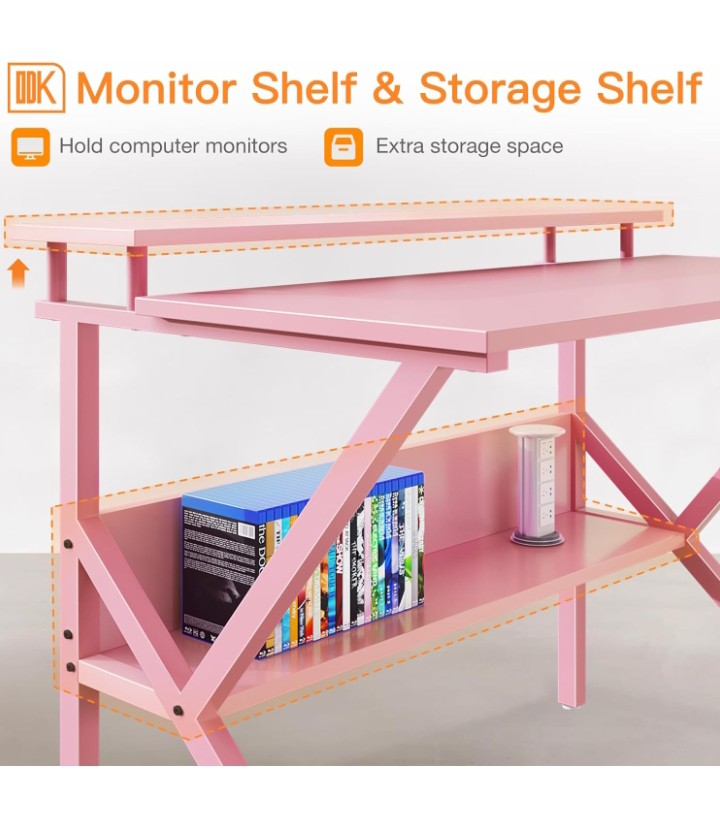 Monitor Shelf & Storage Shelf: This study desk is designed with two shelves. One is monitor shelf, which can hold even two computer monitors that make people have a comfort work position such as looking directly into the screens rather than down, avoiding neck pain. The other is storage shelf below the desktop, which can offer an extra space for storage.