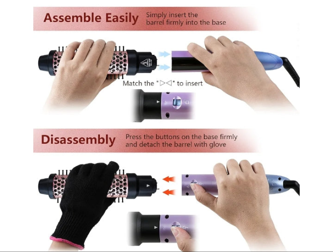 For All Curling Styles: curling iron brush comes with 6 piece interchangeable tourmaline ceramic ion barrels, meets your different curling style needs. Barrels are in different shapes and sizes: cylinder 32mm, cylinder 25mm,cylinder 10mm,conical 19-25mm, conical 9-18mm, curling brush 5cm.These sizes give you six options, meets your different curling style needs, such as big curls, waves, corkscrew curls and ringlets and bounce.