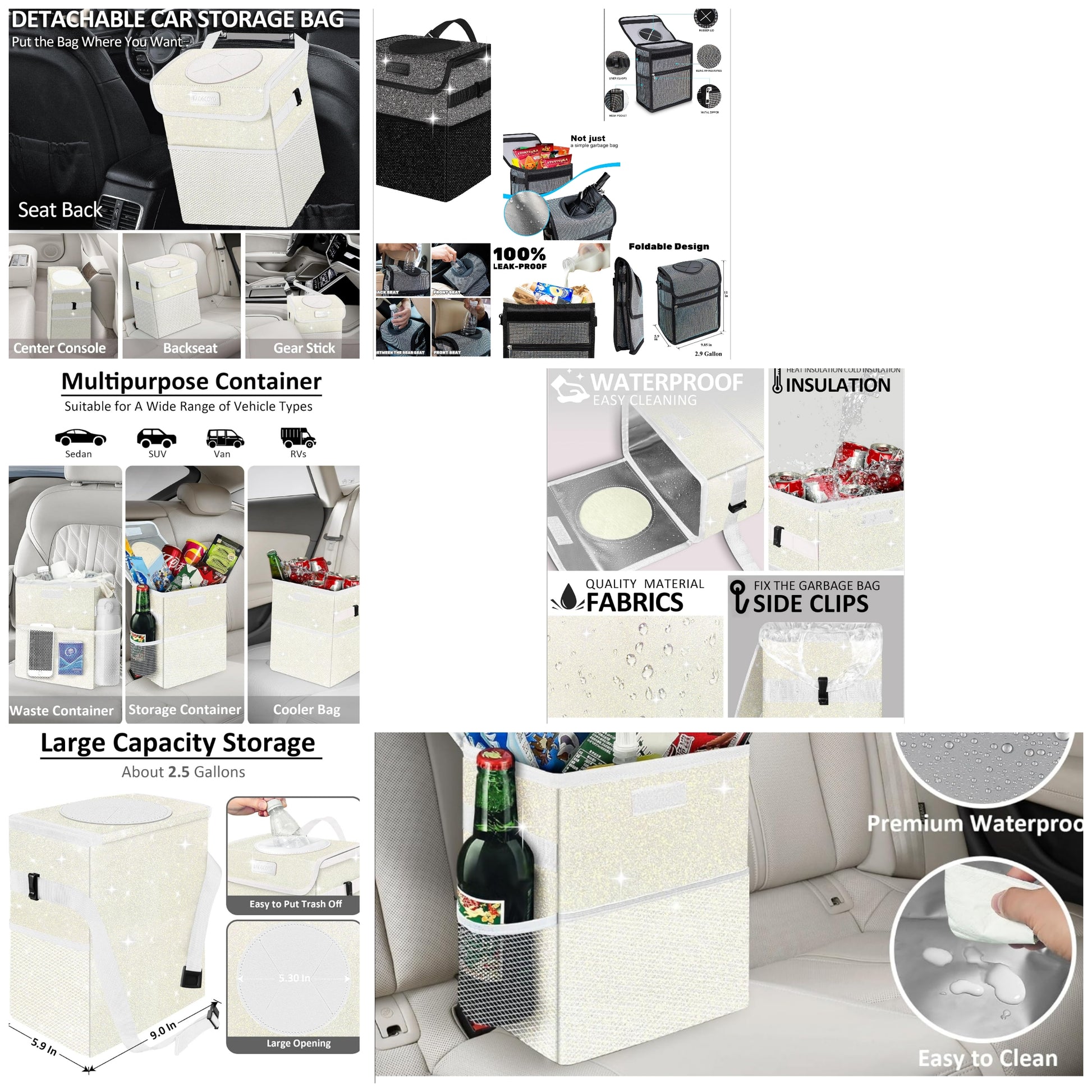 Cute Mini Car Trash Bag with Lid, Glitter Garbage Can Bin Hanging for Back/Front Seat/Console, Waterproof, Leakproof, 2.5 Gallon, Bling Sparkly
