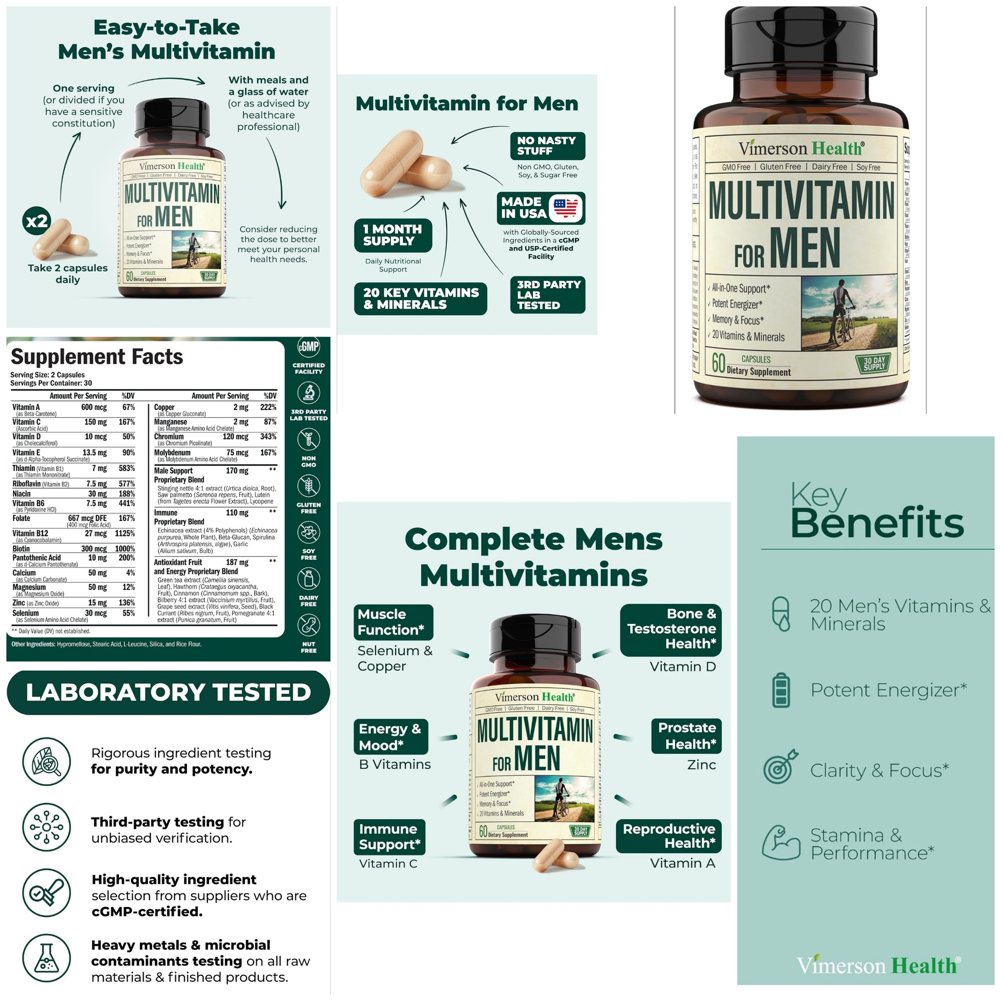 Daily Mens Multivitamins & Multiminerals with Vitamin D, Vitamin C, B12 Zinc & More. Essential Vitamins for Men for Energy, Focus, Stamina, Performance, Mens Health. 60 Capsules