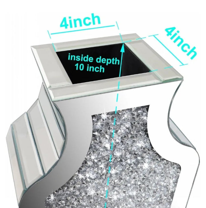 Tall Floor Vase size: 27inch tall,10inch width, 5inch thickness. Thick and strong, elegant Material: crystal mirror and glass on surface, lots of sparkly crush diamond crystal sparkle glaring under glass, inside is MDF construction. Elegance and luxury decorative floor vase for interior decor. Particularly in reflecting light, the floor vase will be very bright. Fantastic Looking.
