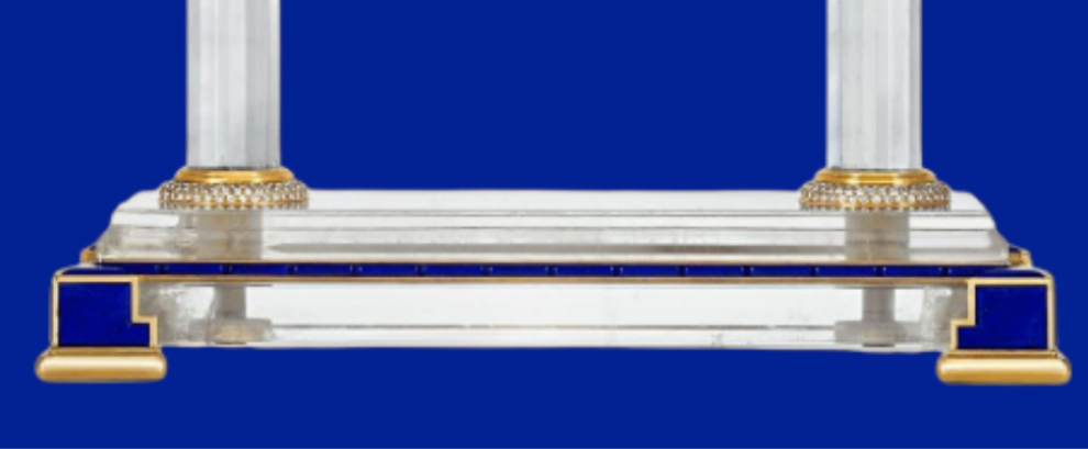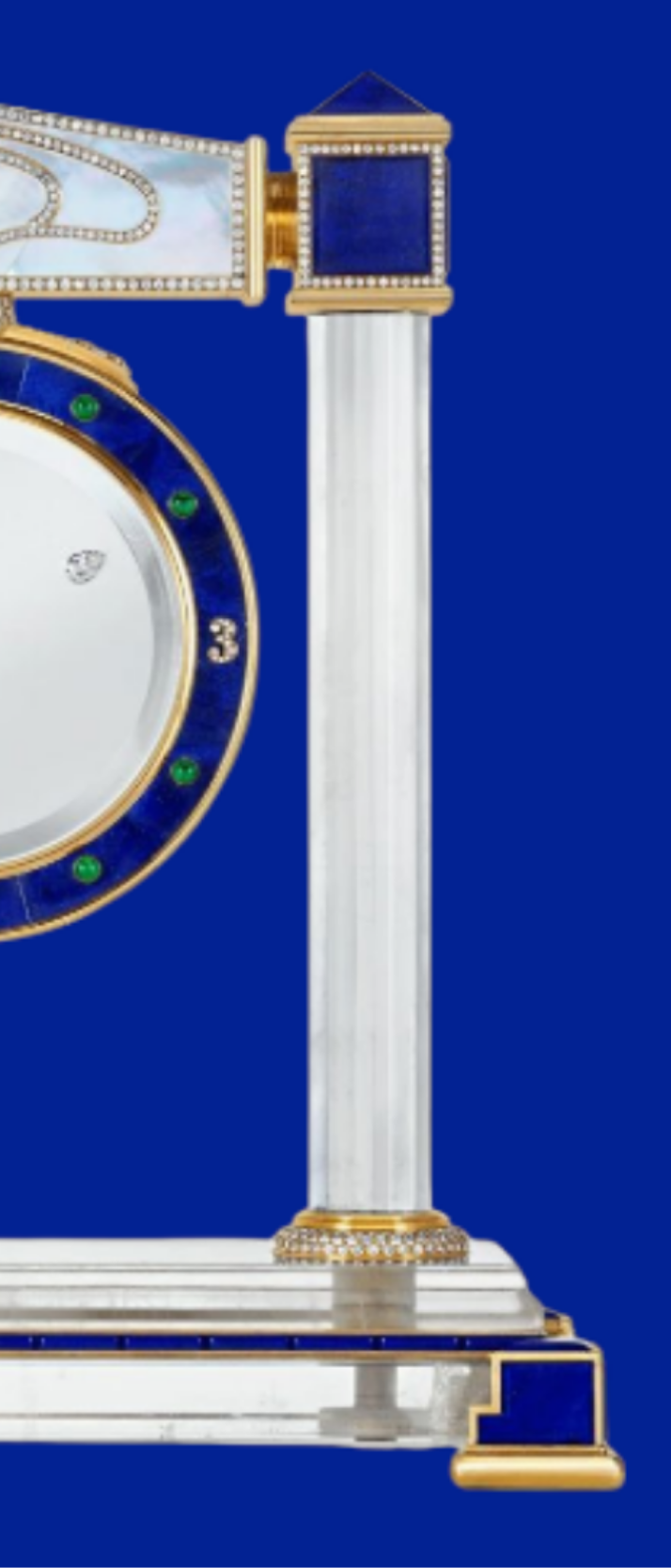This floating diamond mystery clock by renowned horologist Paul Gerber is a singular masterpiece. Not only is it the first mystery clock mechanism to operate without traditional hands or a visible center connection, but it is also crafted with the world’s most exquisite materials. The rock crystal body of the clock features over 2,150 grams of 18K yellow gold and it is adorned with an array of exceptional gemstones: two pear-shaped diamonds (3.02 and 1.79 carats), 49.96 carats of round-cut diamonds and 9.60 carats of cabochon emeralds. Complemented by mother-of-pearl and lapis lazuli, this creation is the epitome of exceptional.