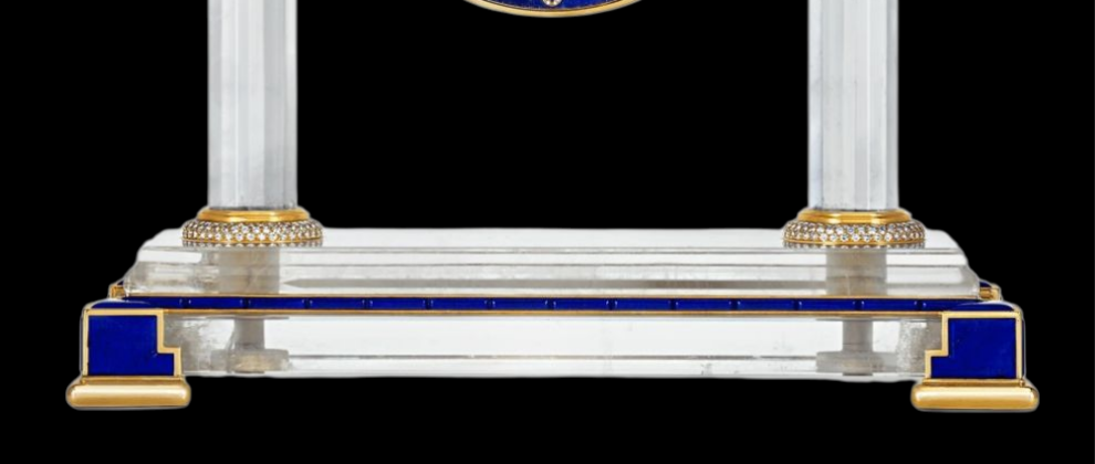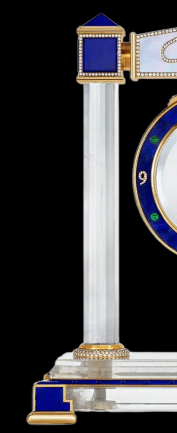 The highest echelon of watchmaking demands a seamless fusion of disciplines: engineering, material science, gem setting and enameling, paired with an intimate understanding of history, navigation, astronomy, theology, philosophy and aesthetics. This exceptional clock embodies all these qualities, serving as a true pinnacle of horological artistry. Its revolutionary movement, the first mystery clock mechanism to operate without traditional hands or a visible center connection, is an unparalleled feat of engineering. Powered by three spring houses with a two-week power reserve and a one-second remontoir device, the mechanism alone took two years to perfect. The rare remontoir movement ensures constant force to the escapement, achieving precision and reliability unmatched by conventional designs.