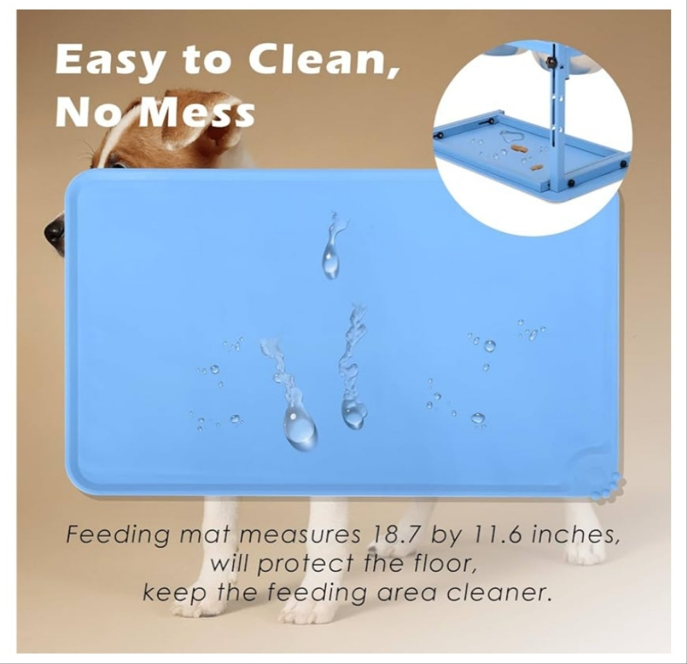 PET INTERACTION:Dog bowl set features a special bell to call your pet, adding fun to meals. Personalize the name tag with the included white pen. The spill mat keeps floors clean