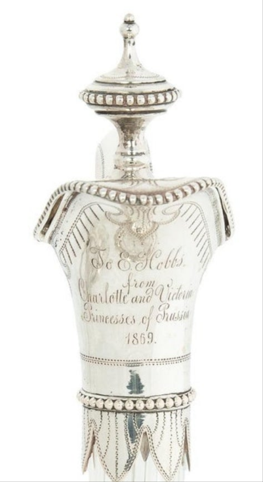 COCOMONEY.STORE,,, AUTHENTIC VERIFIED INSPECED GUARANTEED A pair of silver-mounted crystal Royal presentation claret jugs, each with a globular diamond cut body and long facetted neck, applied with silver spouts with hinged lids and arched handles engraved alternately ‘To E. Hobbs from Henry and Waldemar, Princes of Prussia, 1869’ and ‘To E. Hobbs from Charlotte and Victoria, Princesses of Prussia, 1869.’ German, 750 standard, with maker’s mark ‘KB‘, 1869.