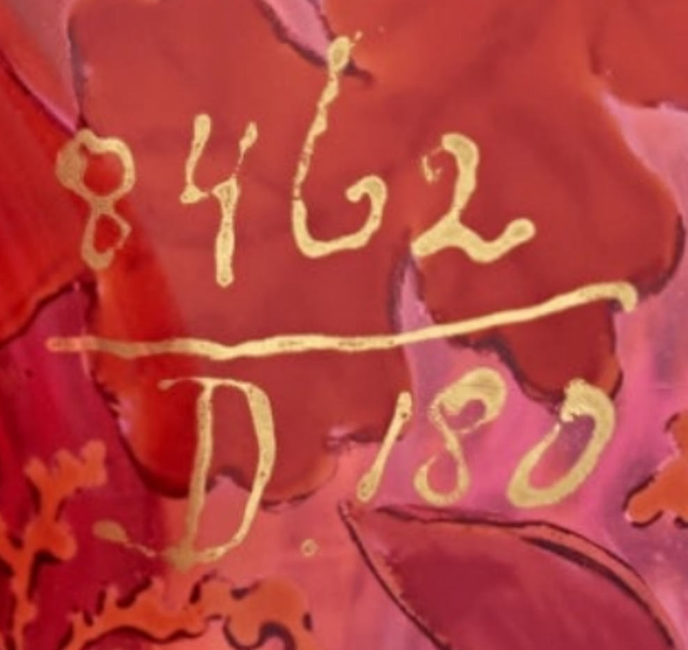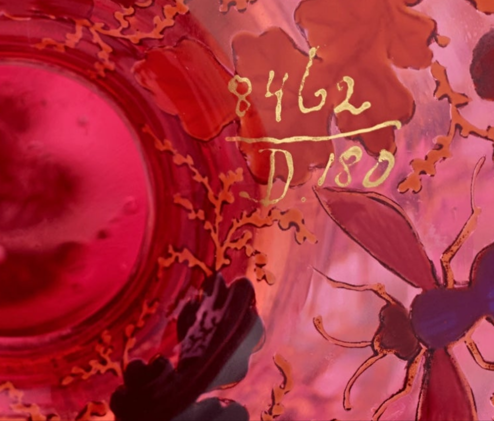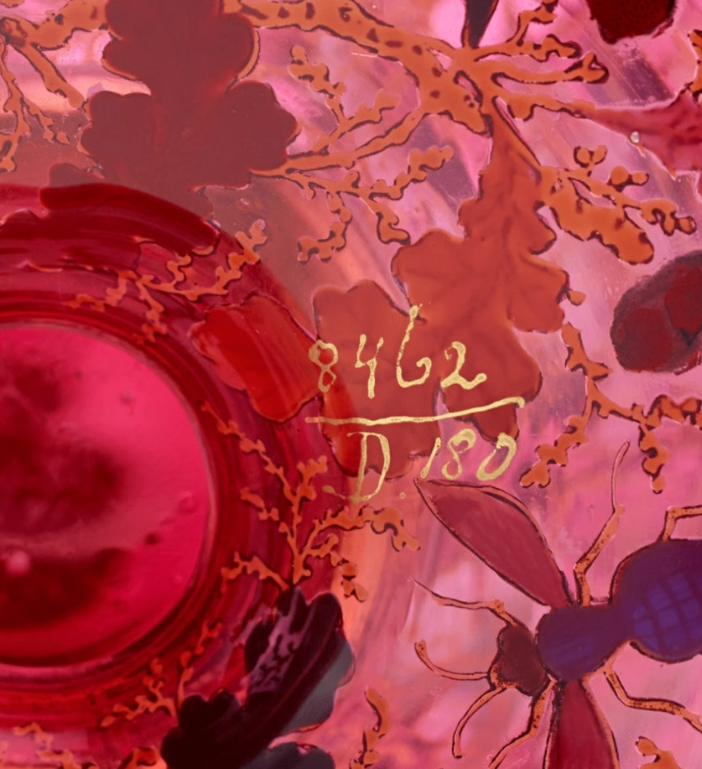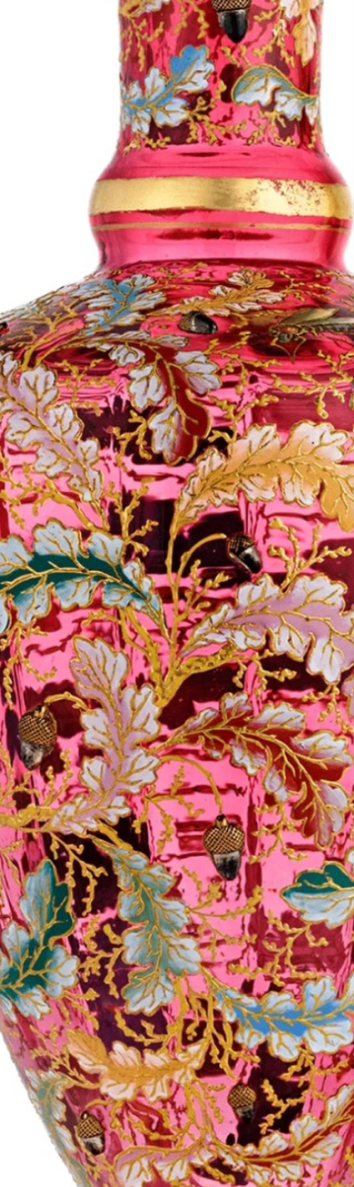 The magnificent cranberry red glass is adorned with hand-painted enamel oak leaves, insects, iconic relief-molded silvered acorns and delicate gilding that extends to the handle, lip and base. At the center, a majestic gilt bas-relief bird takes flight, its shimmering wings spread and beak open in animated speech. Rich in detail and captivating in form, this masterpiece exemplifies Moser’s extraordinary artistry.