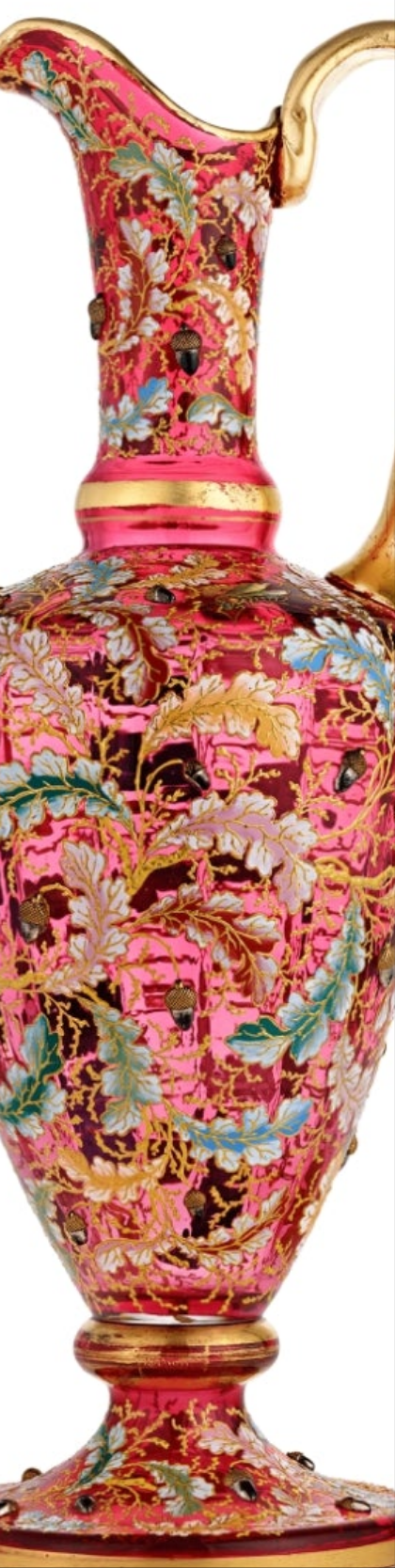 This remarkable Moser pitcher exemplifies the pinnacle of Bohemian art glass. Among the firm’s most exciting creations, ewers often served as canvases for Moser’s most inventive and elaborate designs. This particular example stands out for its impressive scale and mesmerizing decoration, which fully envelops the ewer, elevating it among the finest of Moser’s exceptional glassworks.
