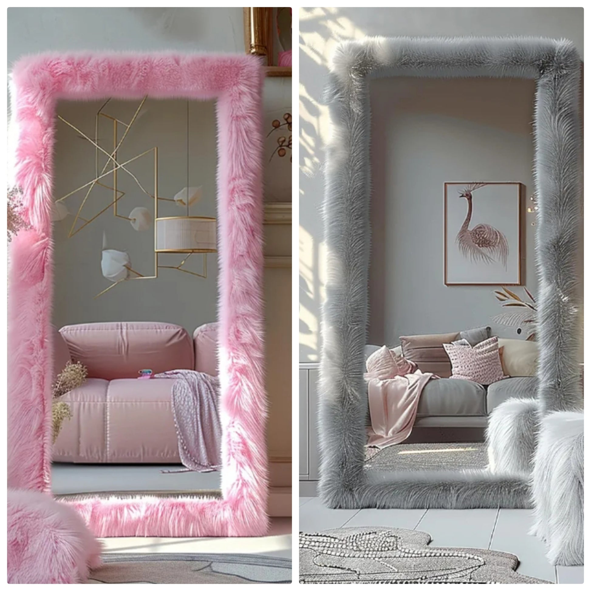 Pink Faux Fur Framed Floor Mirror: The full length standing mirror features a chic and fashion style, adding a touch of elegance to your room. It will be a great wall decor art piece for your home. This full body mirror with sleek looking is also great for selfies or pictures in general