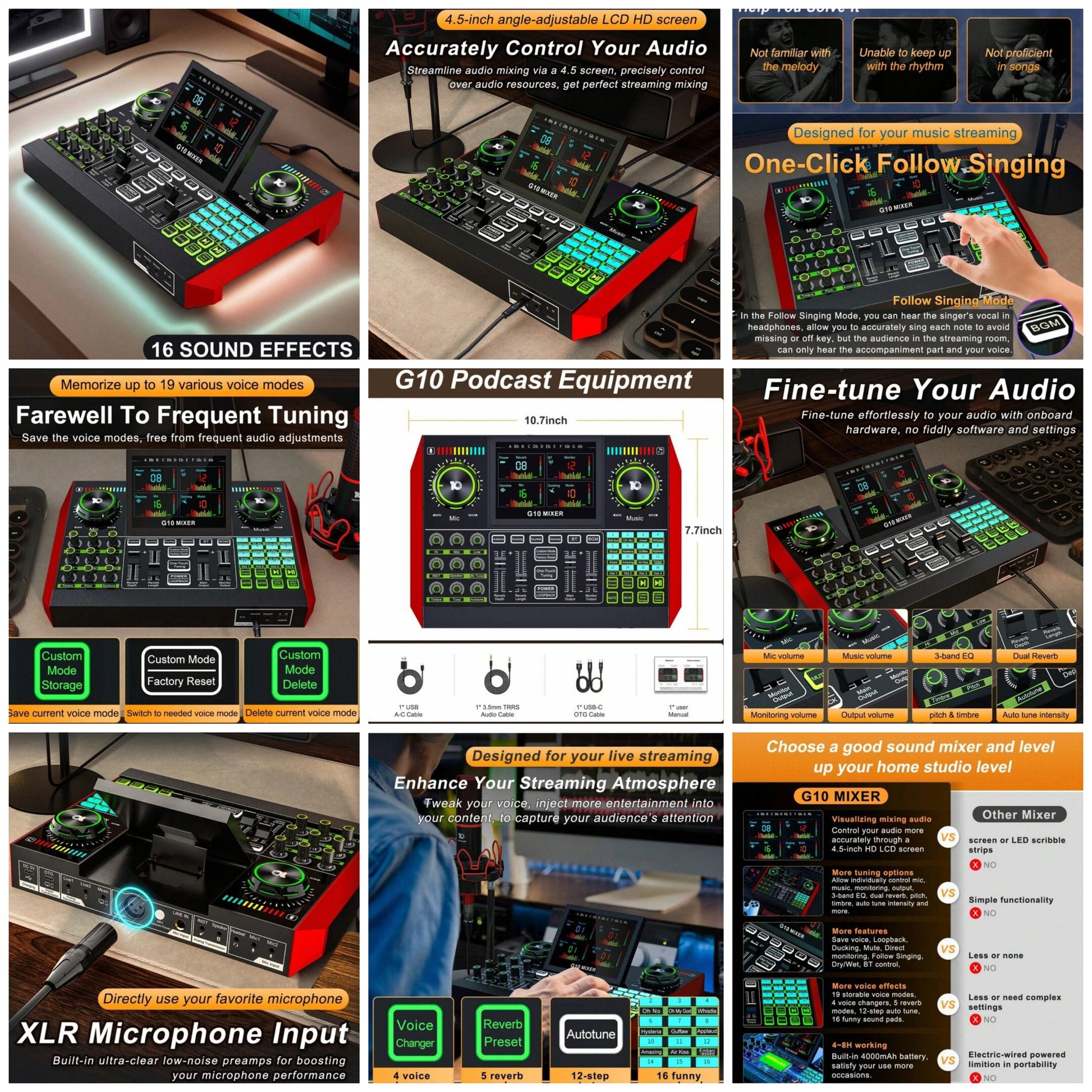 G10 Audio Interface, Podcast Equipment, Live Sound Card For Streaming, 48V Phantom Power, Sound Board, Voice Changer, Audio Mixer With Sound Card For PC Recording Gaming Singing