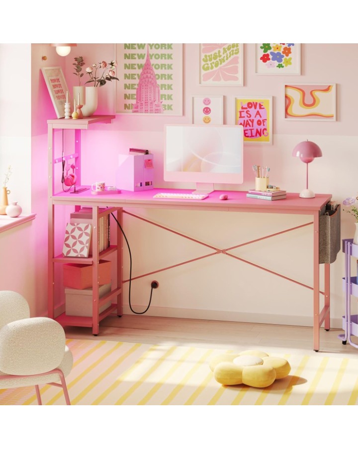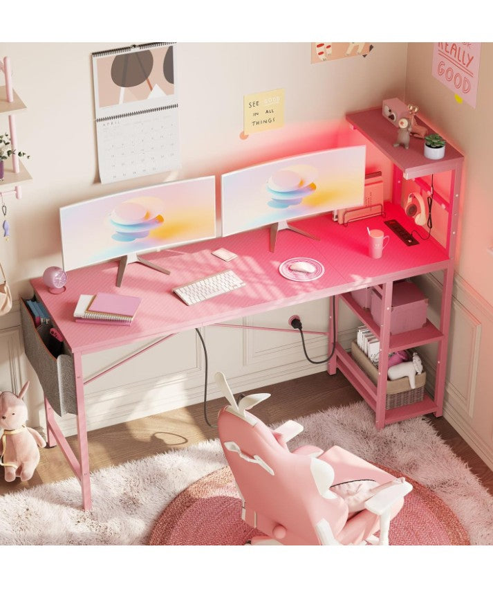 Gaming Desk with Power Outlets, 61 Inch Large Led Gamer Desk with 4 Tiers Reversible Shelves, PC Gaming Table with Headset Hook & Side Storage Bag for Bedroom (Pink 3D Carbon Fiber)ShapeRectangular