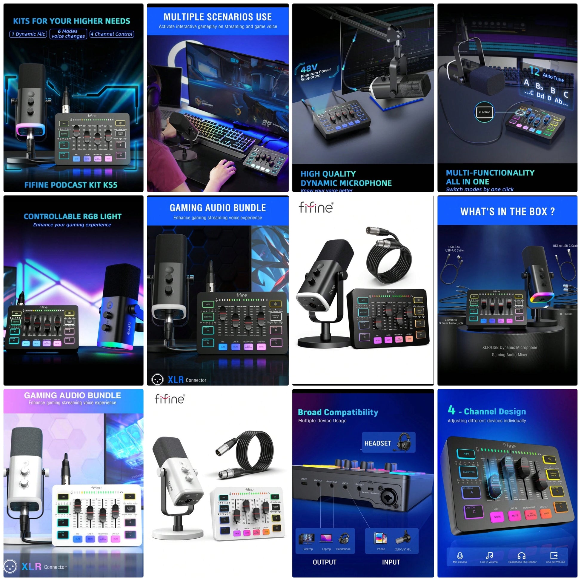 Gaming Equipment Bundle, XLR/USB Streaming Dynamic Microphone With Audio Mixer Set, Podcast Recording Mic With Gain Knob, PC Mixer With Slider Fader Kit For Video, Game Voice-FIFINE KS5 White
