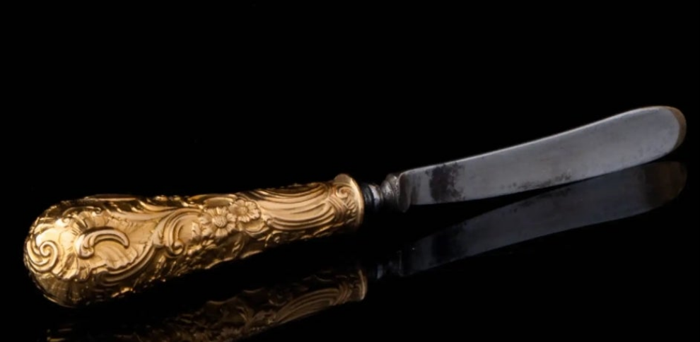 George II gold mounted heliotrope necessaire, c.1750. It stands 3 1/8" tall. One of the bottles has some internal cracks, but it does not appear to have been repaired. The set is missing one implement. Apparently unmarked.