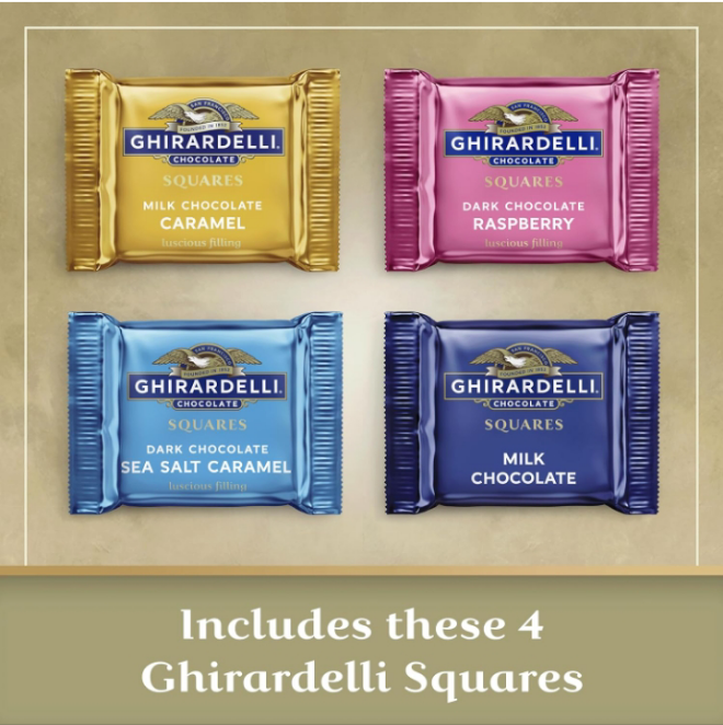 This beautiful gold box of GHIRARDELLI chocolates is ideal for gifting and entertaining, and includes plenty of chocolate candy squares to share
