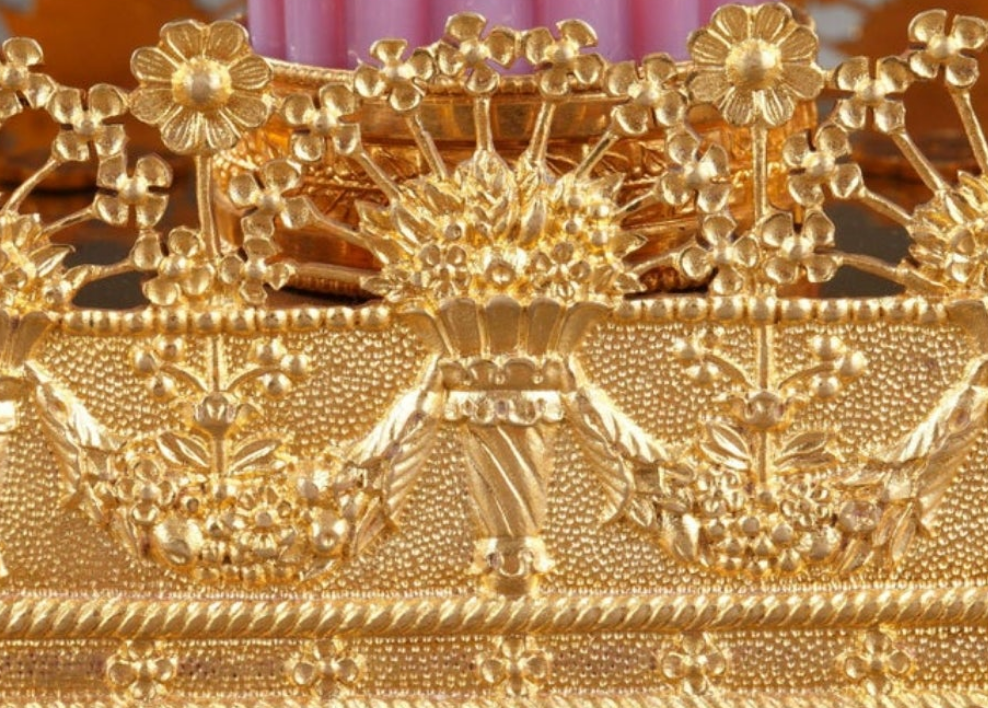 The color play between the shades of matte gold and the high quality of the craftsmanship are characteristic of the production of toiletry items that were created during the early 19th century during the French Restoration period.
