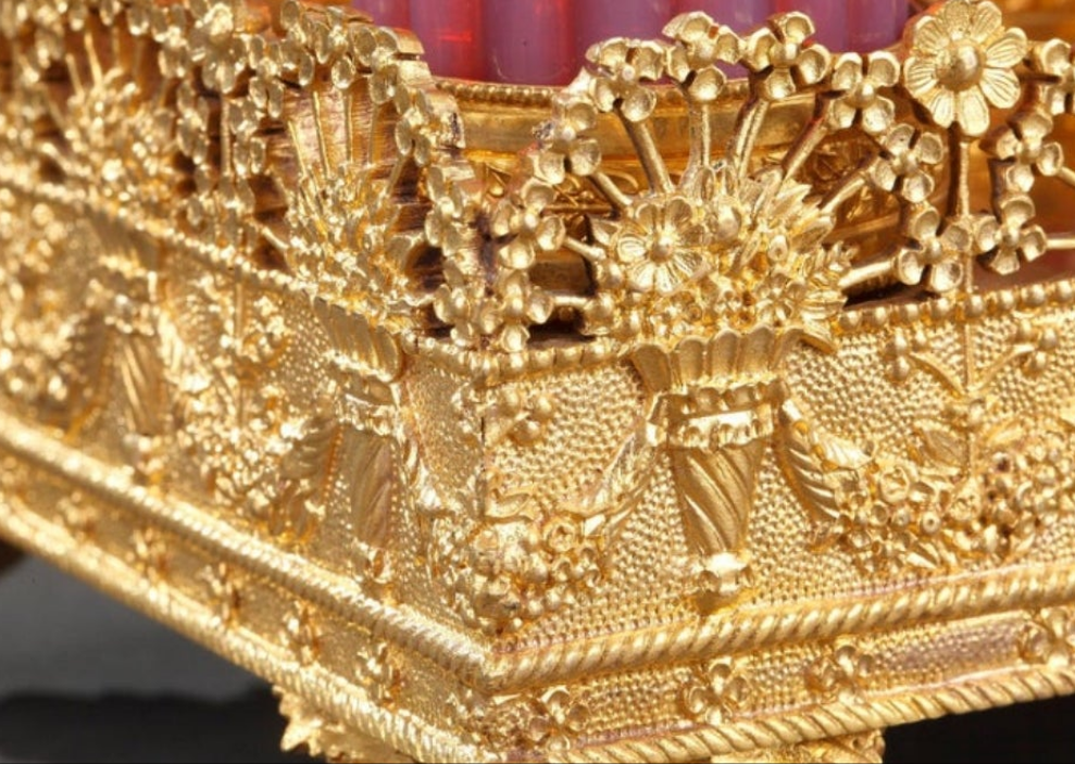 COCOMONEY.STORE,,, AUTHENTIC VERIFIED INSPECED GUARANTEED,,,,Perfume box with six blown and cut opaline crystal flasks set in an open, gilt bronze box. The pink, “pigeon throat” opaline is cut in a gadrooned pattern, and the removable stoppers are set in gilt bronze bands that encircle the neck of the flasks. The gilt bronze box is embellished with a frieze of flower bouquets. Each bouquet has a fan of hydrangea flowers extending from the top that creates a scalloped pattern, and the bouquets are connected by garlands. Inside the box, six circular compartments accented with a geometric pattern hold the flasks in place to stabilize them when the box is moved. The box is set on four lion’s feet.