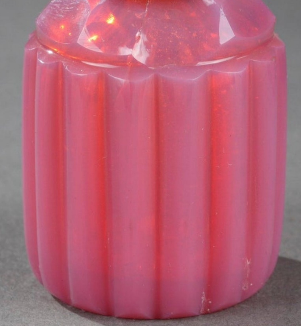 This color of opaline is exceptional and rare. The process of making the crystal opaque involved the use of bone cinders, tin, and arsenic, and magnesium sulfate gives it its pink hue. Only a few production centers in France were equipped to create these types of colors, such as Le Creusot, Baccarat, Saint-Louis, and Choisy-le Roi.
