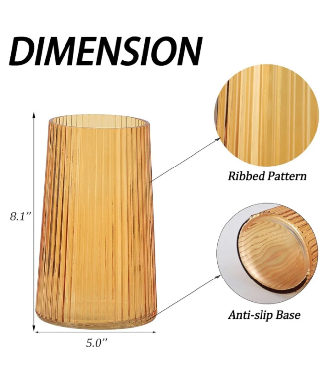 Glass Vase for Flower, Flower Vase for Bouquet, Modern Glass Vase, Ribbed Glass Vase for Living Room, Bedroom, Dining Table, Office, Wedding, Centerpieces, 8-Inch