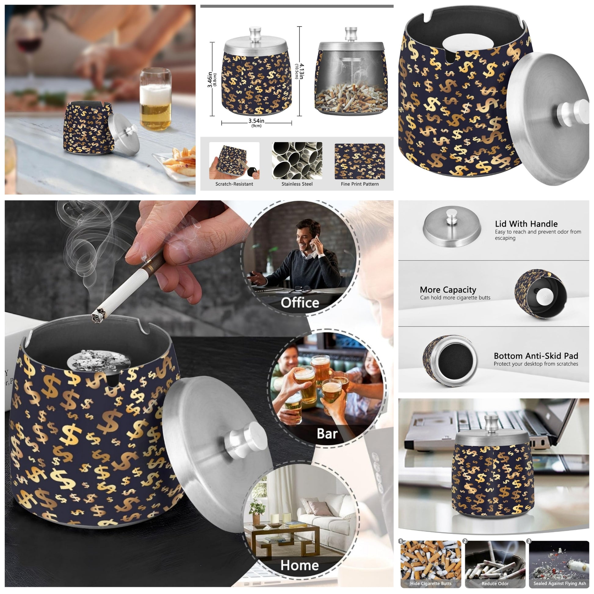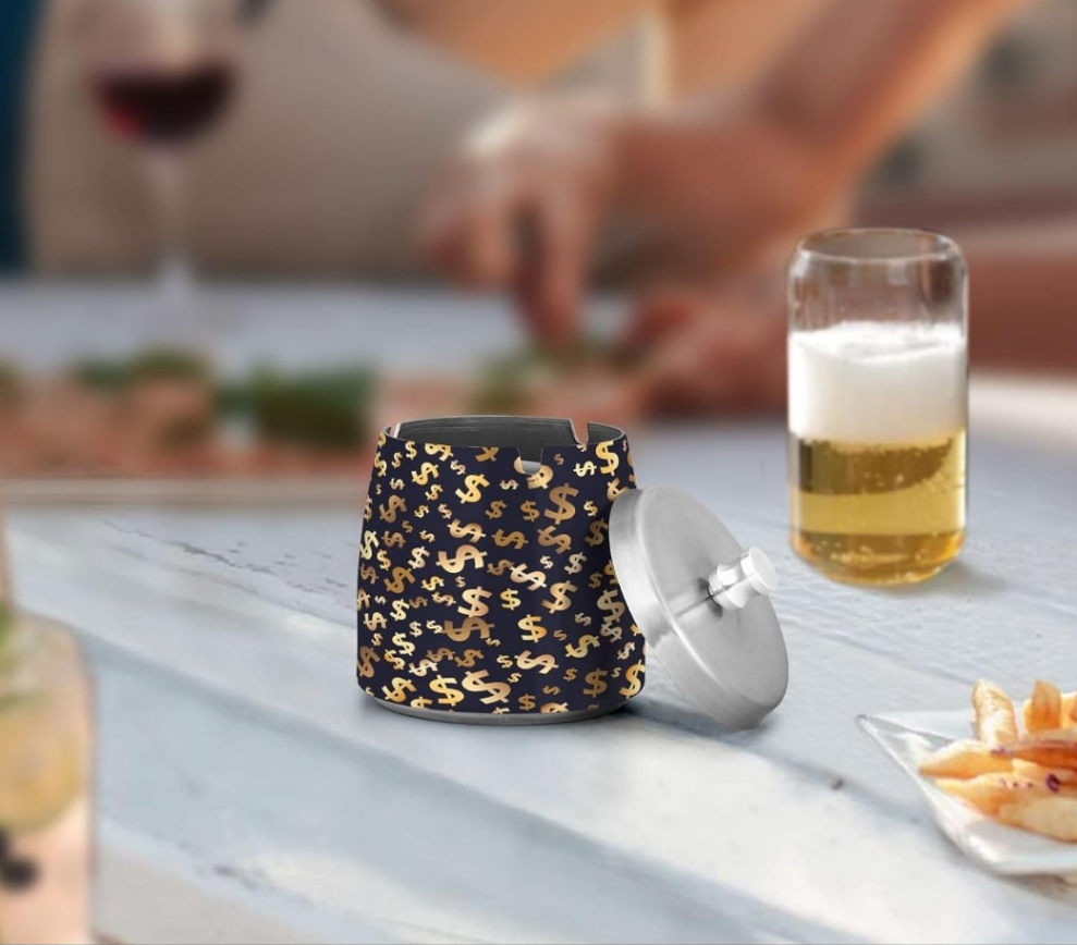 Gold Dollar Flying Ashtray with Lid, Ash Tray for Cigarettes Smokers, Smokeless Home Ashtray with Cover Smell Proof for Indoor Outdoor, Windproof Outside Metal Ashtrays for Patio Material Stainless Steel