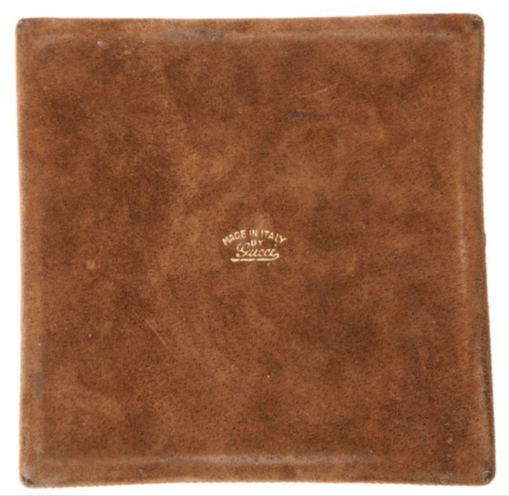 COCOMONEY.STORE AUTHENTIC INSPECED GUARANTEED Gucci Horsebit double ashtray, brass, gold leaf, nickel, leather, signed. Chunky equestrian themed twin ashtrays from the storied luxury brand. The nickeled brass handle swivels and is stamped "Gucci" on the top center. Additionally signed: "Made in Italy by Gucci" on the brown leather undersides. Measurements are with the trays fully extended - see first photo.