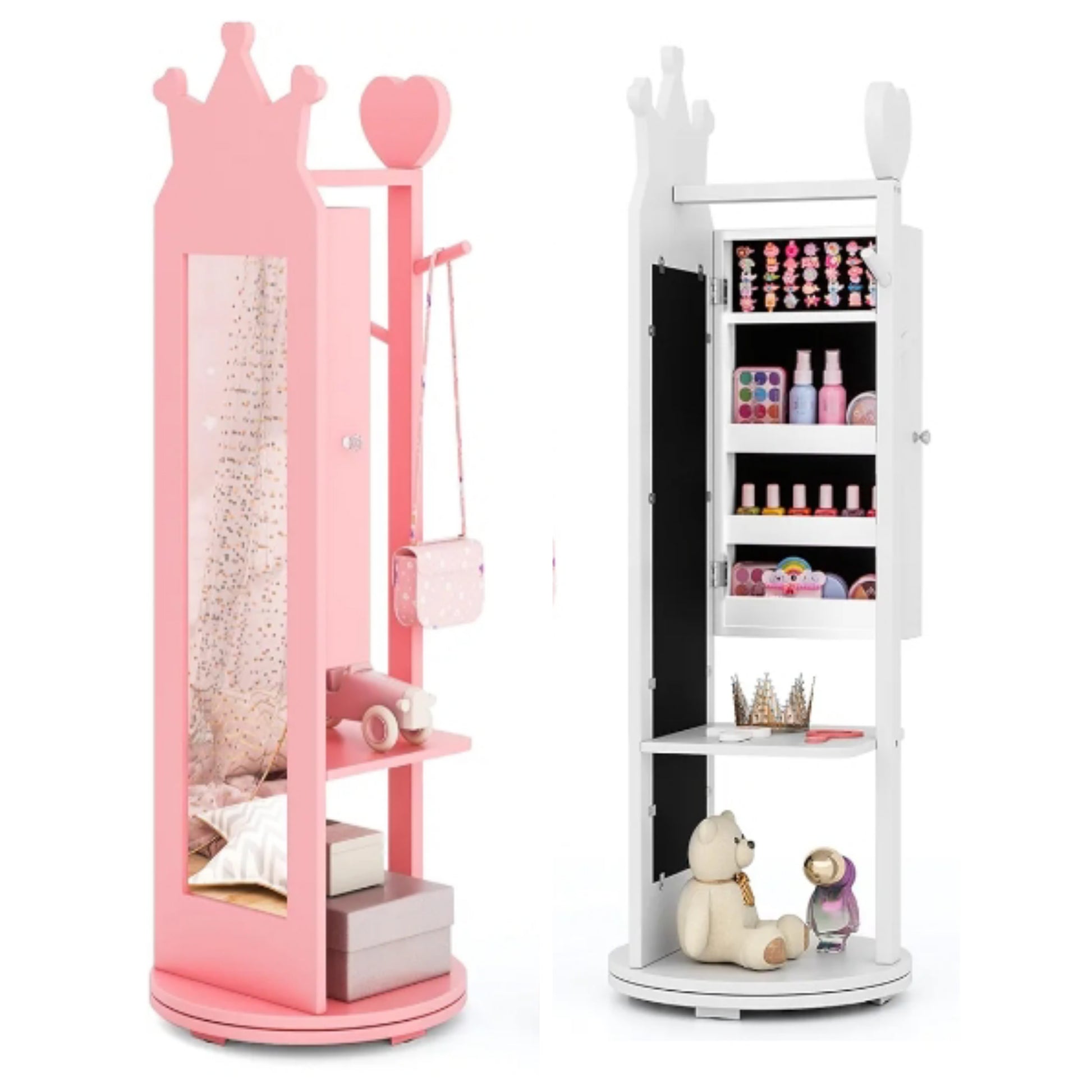 Kids Jewelry Armoire, 360° Swivel Jewelry Cabinet with Full Length Mirror & Garment Rack, Kids Vanity Dress Up Mirror with Jewelry Storage, 44” Standing Jewelry Organizer